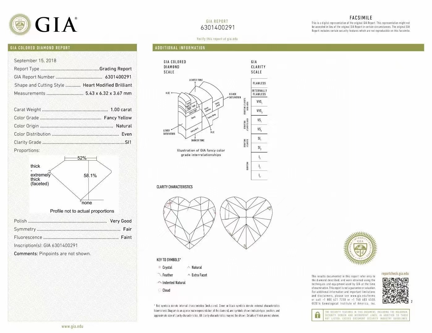 Низкий бриллиант среднего цвета желтого цвета 1,01 карата в форме сердца