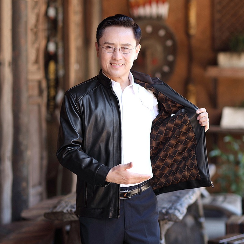 Золотое бархатное кожаное пальто мужское пальто среднего и пожилого возраста хорошая кожаная куртка с воротником-стойкой на флисовой подкладке папа зимнее пальто экспорт Эксклюзив