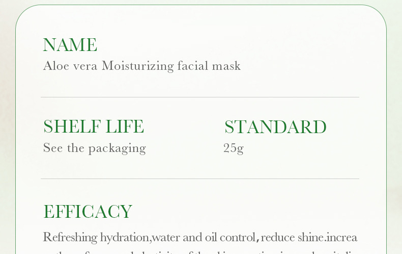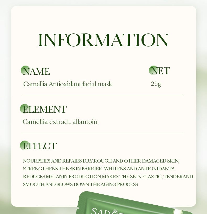 Полуничная клубничная маска 25 г [только для экспортных продаж внешней торговли, продажи на внутреннем рынке запрещены, покупка означает оговорку и взять на себя ответственность]; Камелия Камелия Маска 25 г [Только для экспортных продаж внешней торговли, продажи на внутреннем рынке запрещены, покупка означает оговорку и взять на себя ответственность]; Черничная черничная маска для лица 25 г [только для экспортных продаж внешней торговли, продажи на внутреннем рынке запрещены, покупка означает отказ и оплату от ответственности]; Маска персика нектарины 25 г [только для экспортных продаж внешней торговли, продажи на внутреннем рынке запрещены, покупка означает оговорку и взять на себя ответственность]; Маска с фруктами киви 25 г [Только для внешнеторговых экспортных продаж, продажи на внутреннем рынке запрещены, покупка означает оговорку и взять на себя ответственность]; Маска ромашки 25 г [Только для экспортных продаж внешней торговли, продажи на внутреннем рынке запрещены, покупка означает нести ответственность и взять на себя ответственность]; Маска календулы из календулы 25 г [только для экспортных продаж внешней торговли, продажи на внутреннем рынке запрещены, покупка означает отказ от ответственности и взять на себя ответственность]; Маска для лица из риса и риса 25 г [только для экспортных продаж внешней торговли, продажи на внутреннем рынке запрещены, покупка означает отказ и оплату от ответственности]; Маска алоэ алоэ 25 г [только для экспортных продаж внешней торговли, продажи на внутреннем рынке запрещены, покупка означает отказ от ответственности и взять на себя ответственность]; Маска Rose Rose Rose 25 г [Только для внешнеторгового экспорта, внутренние продажи запрещены, покупка означает отказ и оплату от ответственности]; Маска зеленого чая и зеленого чая 25 г [только для экспортных продаж внешней торговли, продажи на внутреннем рынке запрещены, покупка означает отказ и оплату от ответственности]