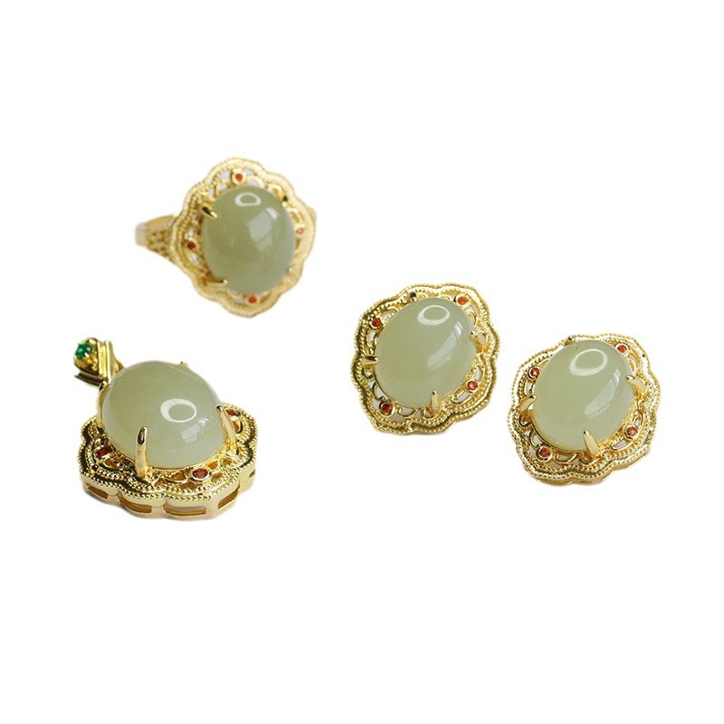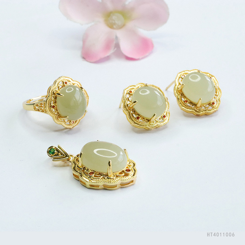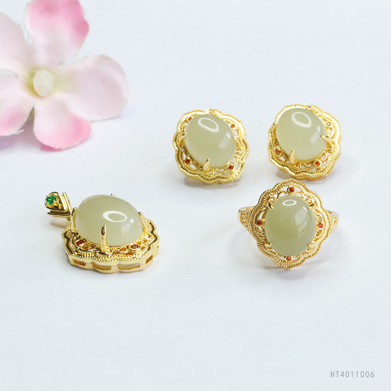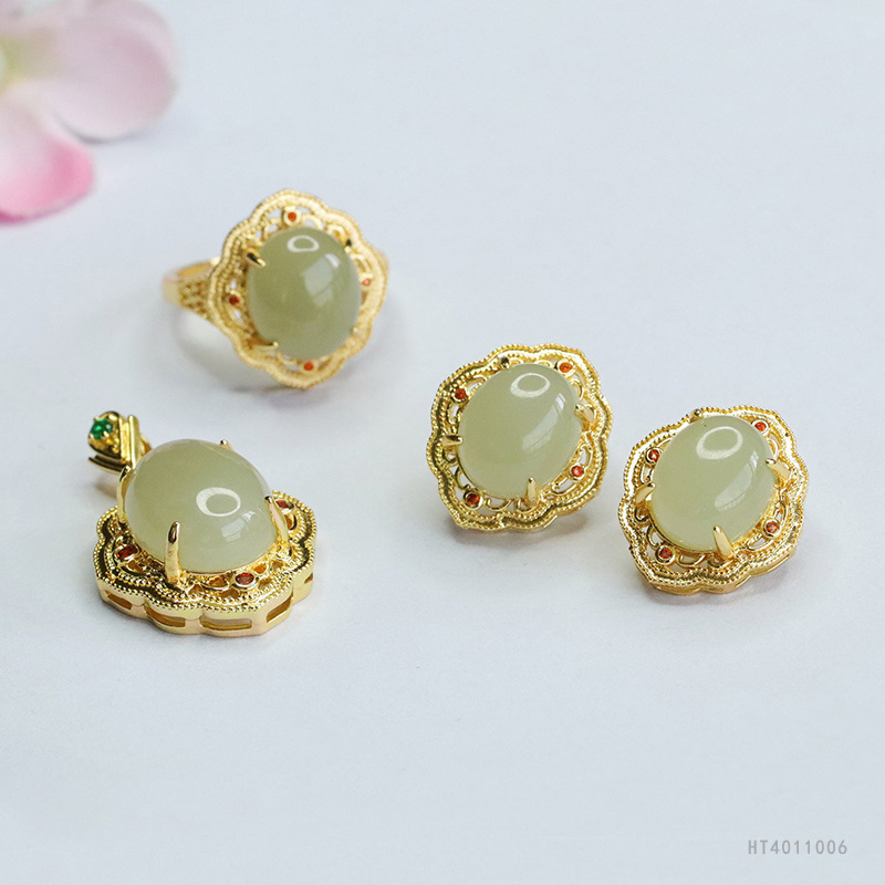 Ретро-кольцо Hetian Yuqinghui (поверхность яйца около 10*12 мм) HT4011006; Ретро-подвеска Hetian Yuqinghui без цепочки (поверхность яйца около 12*16 мм) HT4011006; Серьги в стиле ретро Hetian Yuqinghui (поверхность яйца около 10*12 мм) HT 4011006; Hetian Yuqinghui ретро комплект из трех предметов (подвеска в комплект не входит цепочка) HT4011006