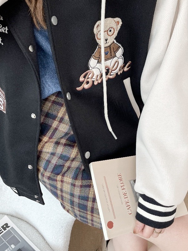 春款连帽撞色拼接袖卫衣刺绣宽松美式学院风外套单排扣上衣