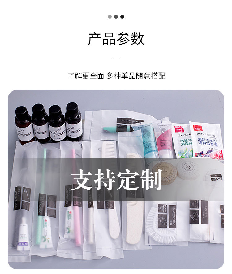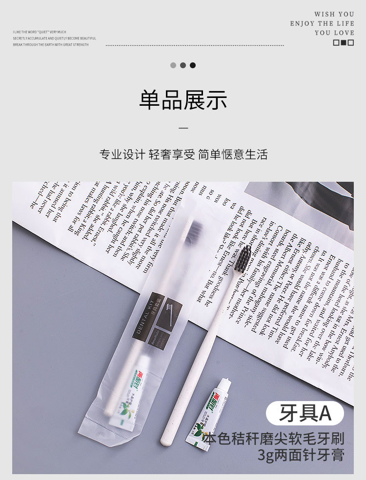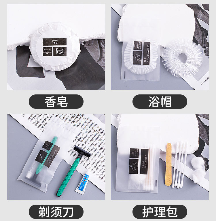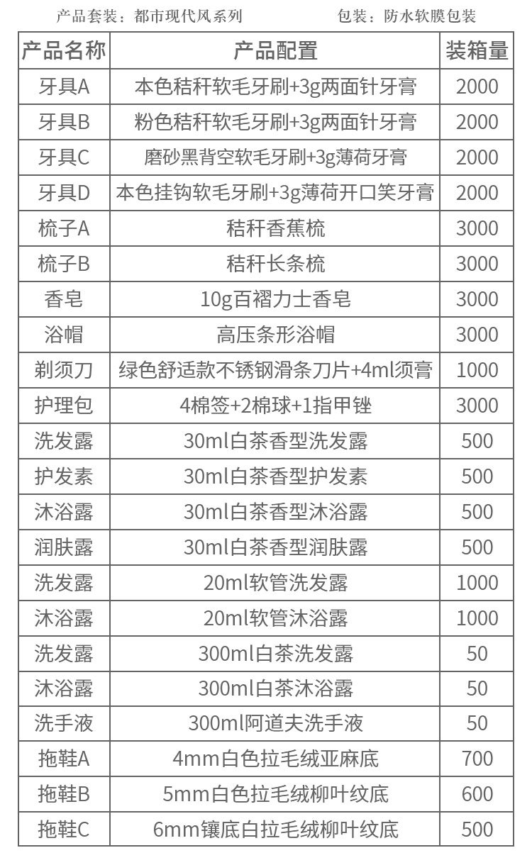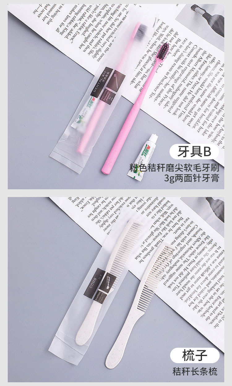 Зубная паста с волокном 3g + матовая черная зубная щетка; Зубная паста с волокном 3g + зубная щетка с мягкой щетиной и бежевым крючком; Зубная паста Liangmianzhen 3 г + зубная щетка с мягкой щетиной бежевого цвета.; Зубная паста Liangmianzhen 3 г + зубная щетка с мягкой щетиной из зеленой соломки; Зубная паста Liangmianzhen 3 г + зубная щетка с мягкой щетиной из розовой соломки; Зубная паста Liangmianzhen 3 г + зубная щетка с мягкой щетиной для большого живота; Длинная расческа из бежевой соломки; Банановая расческа из бежевой соломки; Шапочка для душа [шапочка для душа высокого давления]; Свежее мыло 8г.; Маленькое круглое мыло 10г.; Мешок для бритья в полипропиленовом пакете [тюбик крема для бритья 4 мл + бритва с двойным лезвием]; Сумка для бритья [крем для бритья из шланга 4 мл + двухслойное лезвие из нержавеющей стали с ползунком бритвы]; Пакетик для ухода [4 ватных тампона + 2 ватных шарика + 1 пилочка для ногтей]; Швейный набор [6 ниток, 1 игла, 2 пуговицы, 1 булавка]; 30 мл шампуня; 30 мл геля для душа; кондиционер 30 мл; 30 мл лосьона для тела; Тапочки [4мм белый плюш]; Тапочки [6мм белый плюш]; Ткань для чистки обуви ножевого типа; Ткань для чистки обуви пальцевого типа; Одноразовое полотенце для лица + банное полотенце.