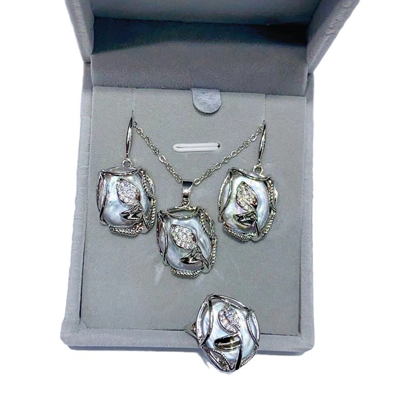 Комплект жемчуга в стиле барокко с кронштейном из белого золота; Подвеска с жемчугом в стиле барокко из белого золота; Кольцо с жемчугом в стиле барокко из белого золота; Серьги с жемчугом в стиле барокко из белого золота; Набор держателей серого цвета в стиле барокко; Серый серебряный кулон в стиле барокко.; Серые серебряные кольца в стиле барокко.; Серые серебряные серьги-гвоздики в стиле барокко.