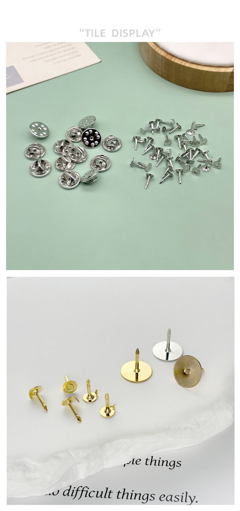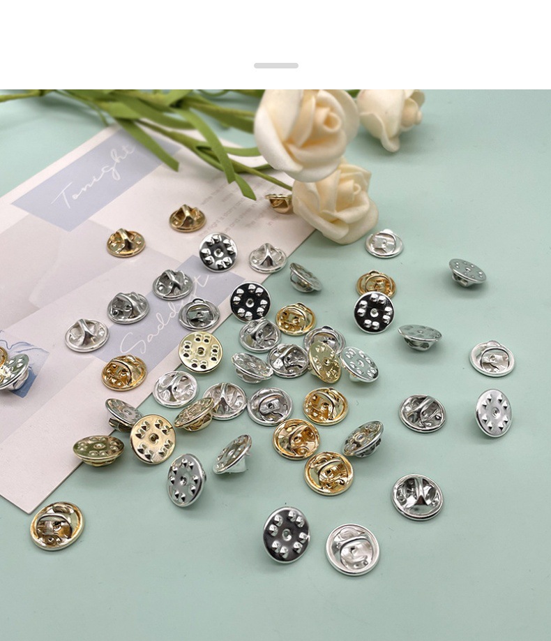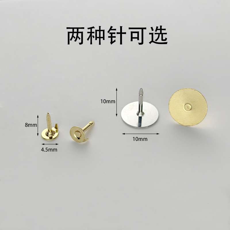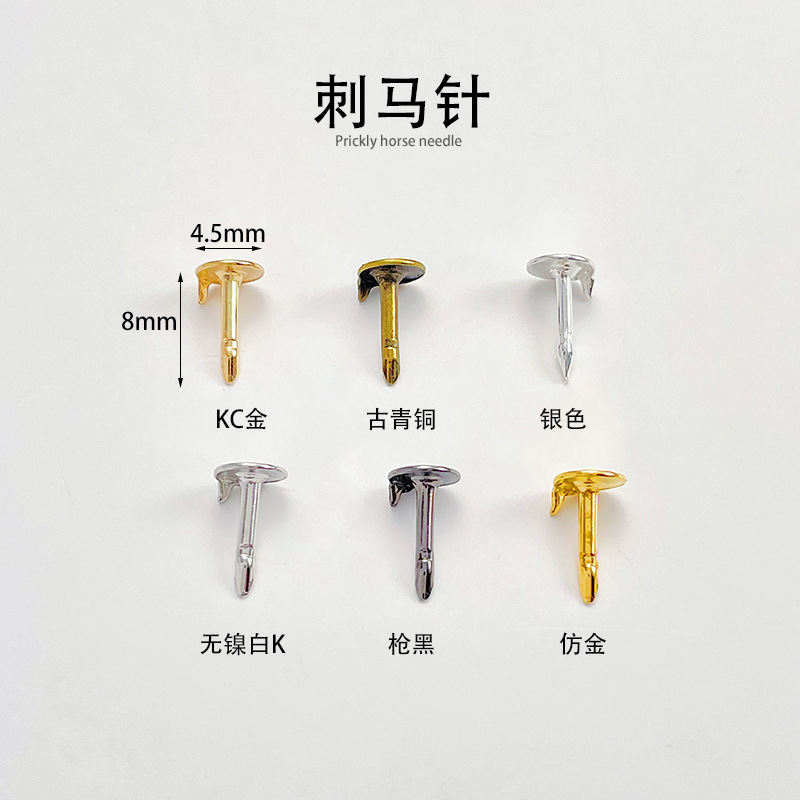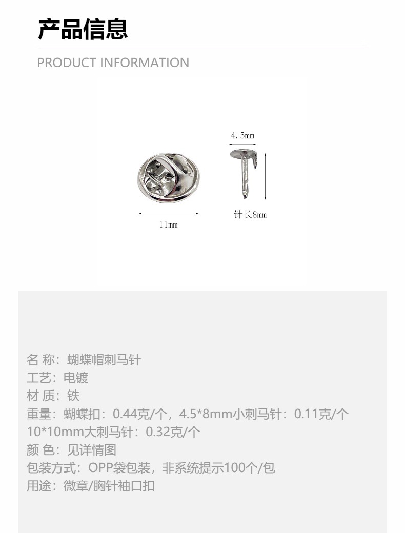 Маленькая игла 4,5*8 мм.; Большая игла шпоры 10*10 мм.; пряжка-бабочка 11 мм.; Пряжка-бабочка + игла для шпор