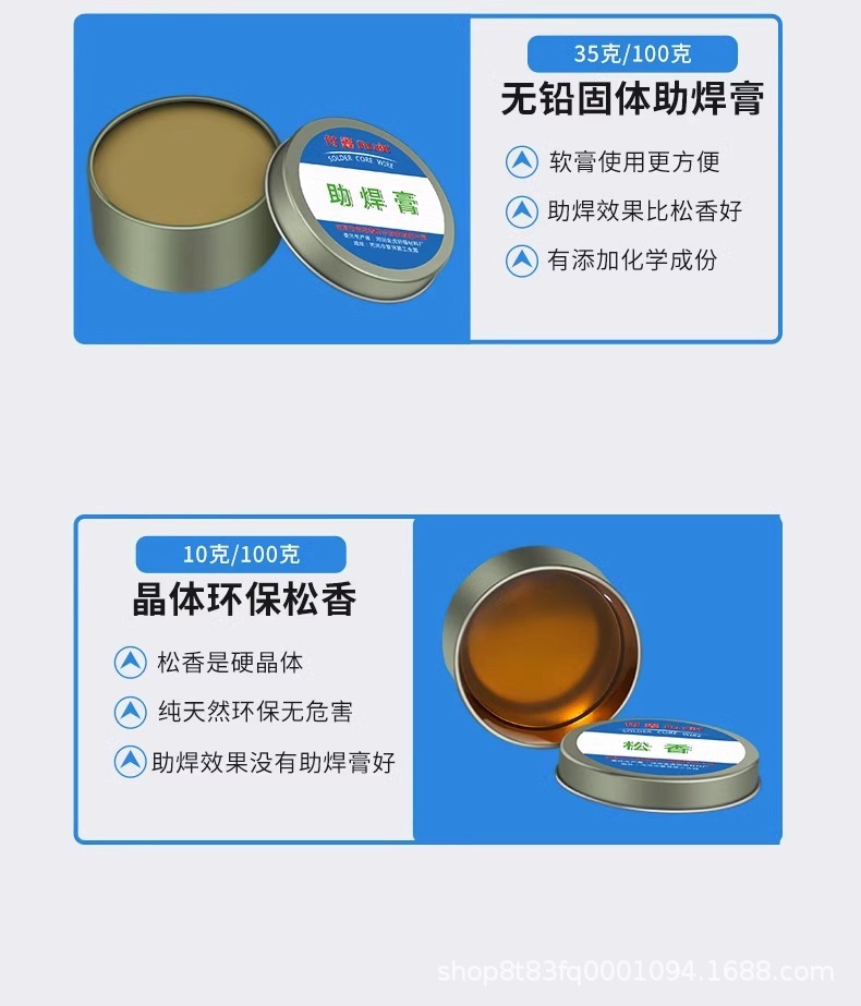 35 г флюсовой пасты [пластиковая коробка]; 100 г флюсовой пасты [железный ящик]; 10 г канифоль [Картон]; 100 г канифоль [железный ящик]