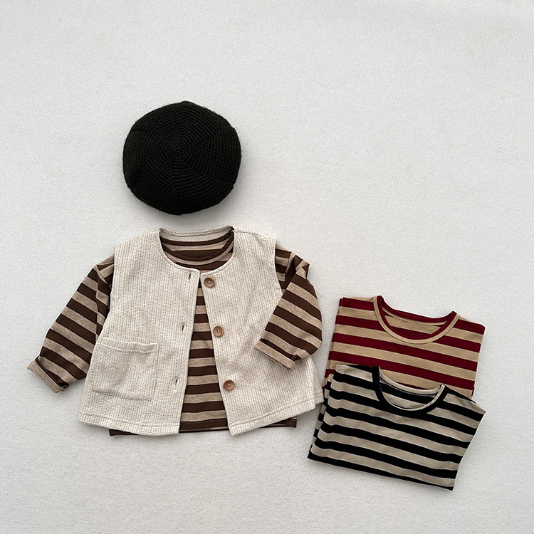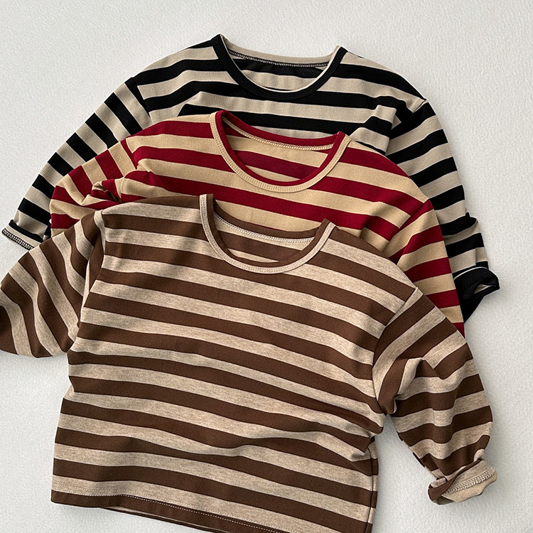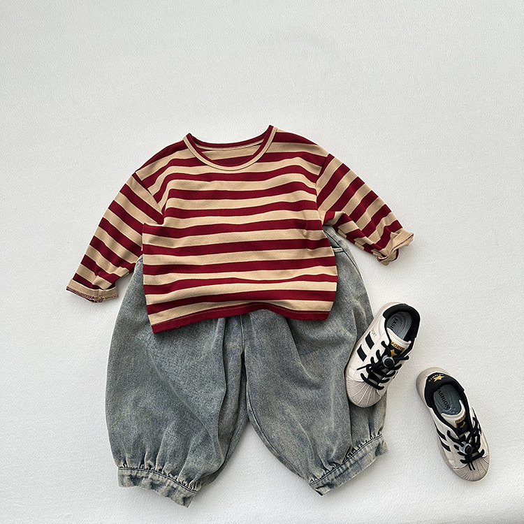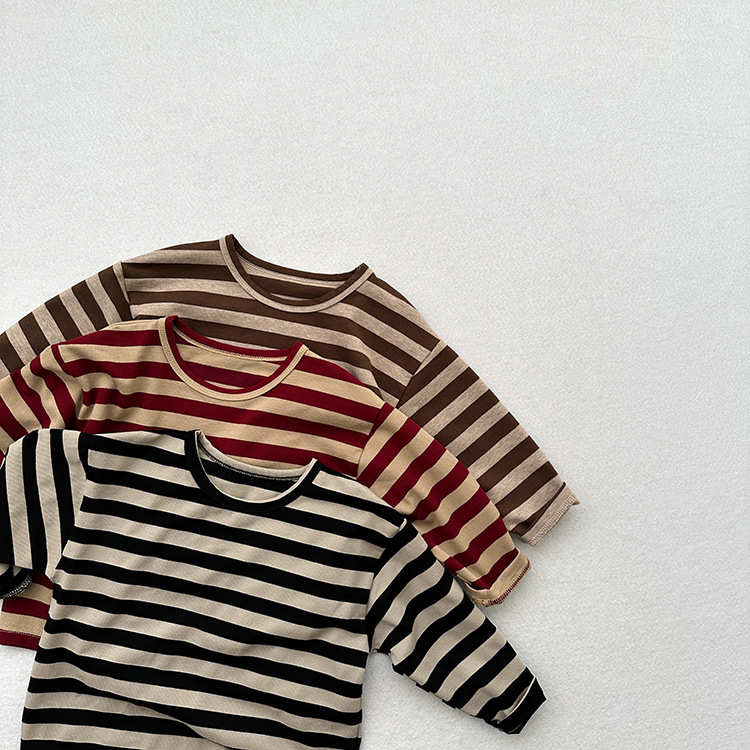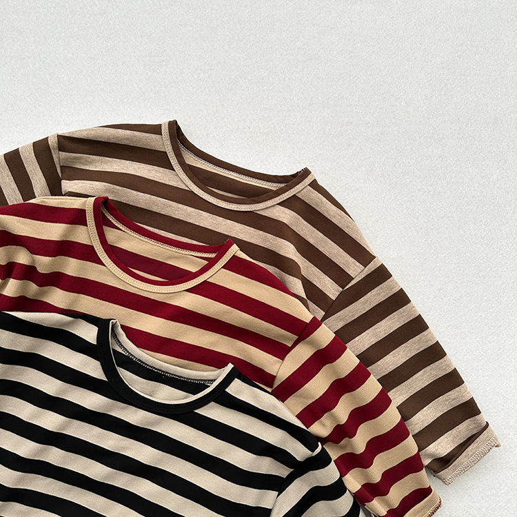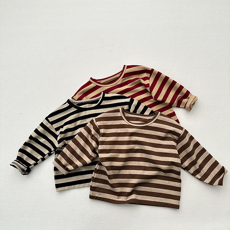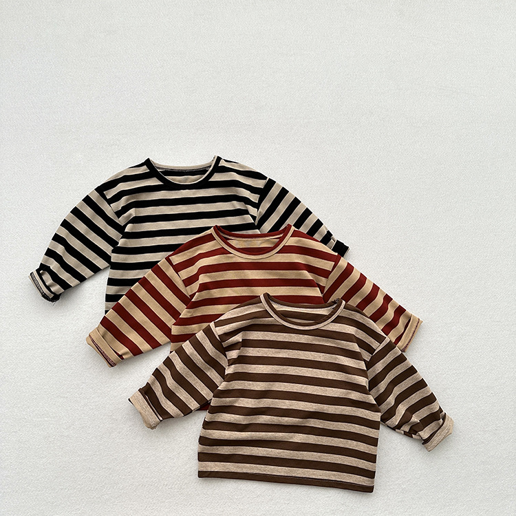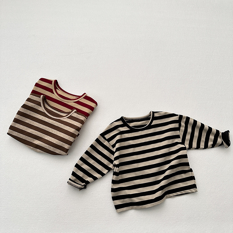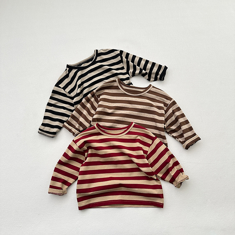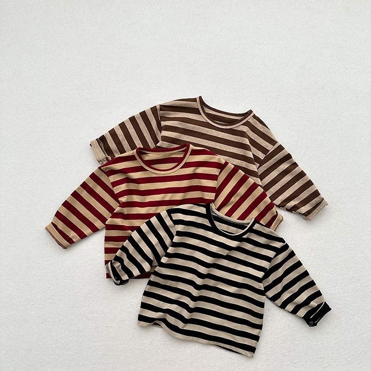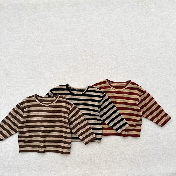 Детская футболка с длинными рукавами, весна и осень, универсальная новая рубашка в полоску для мальчиков и девочек, свободная рубашка с круглым вырезом в стиле ретро