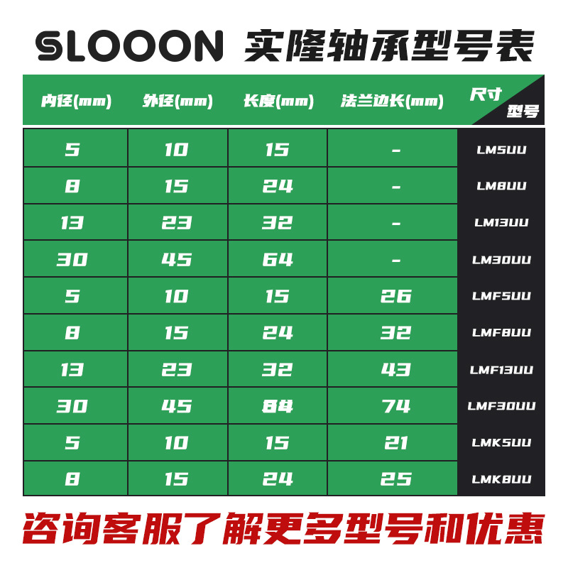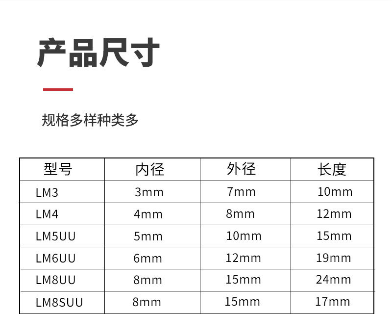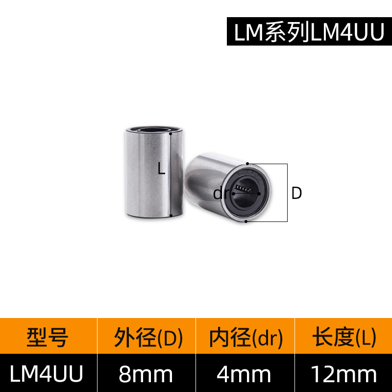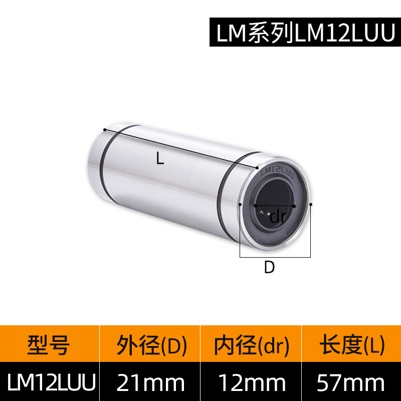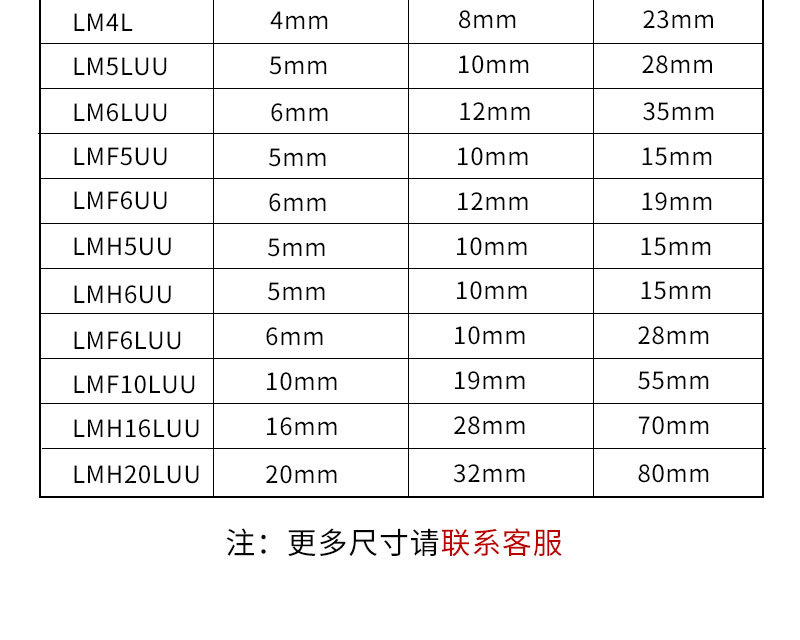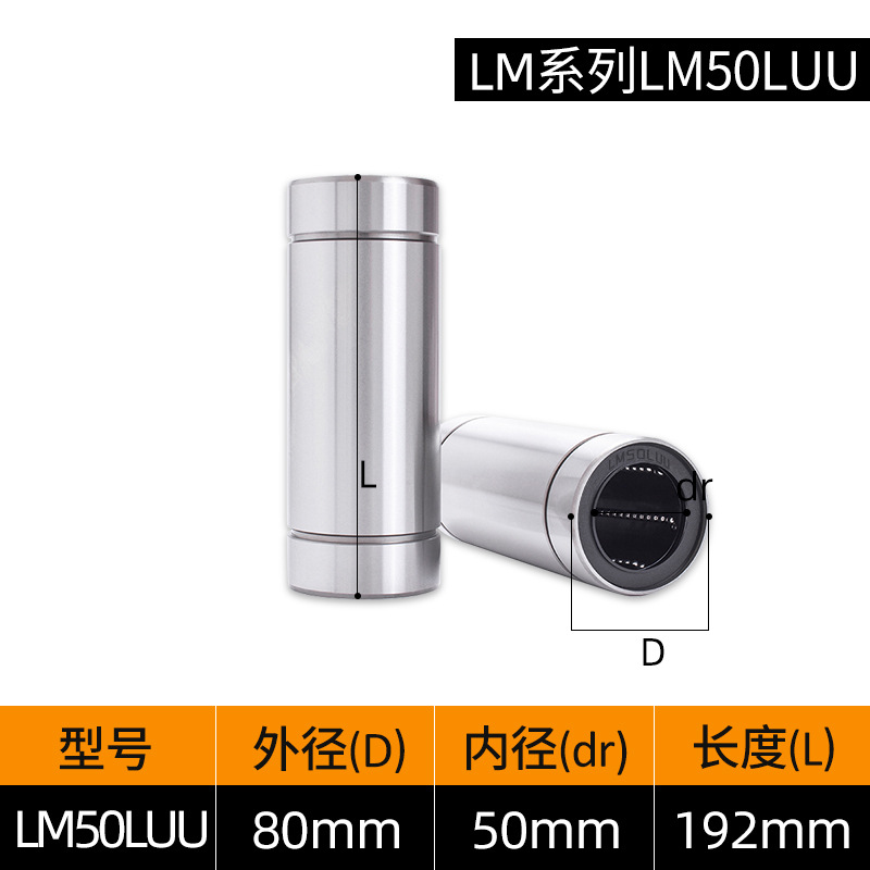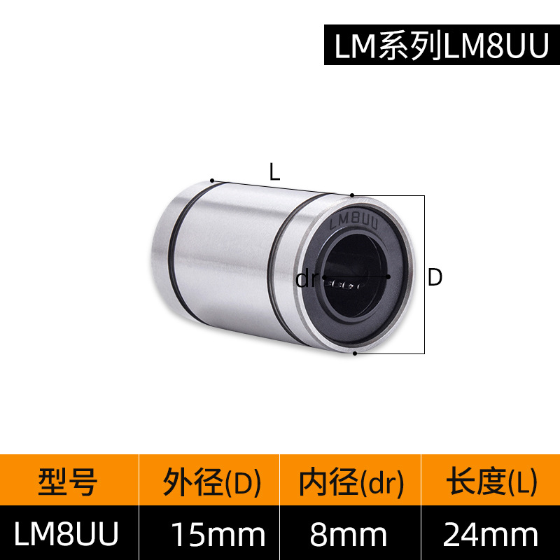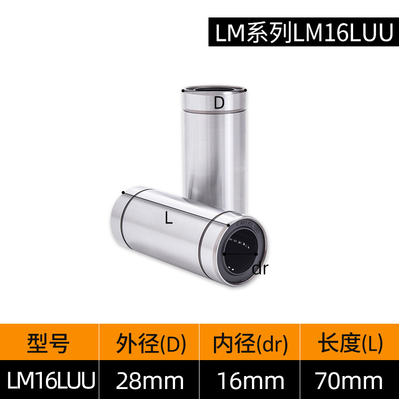 LM3UU [обычная модель] 3*7*10 мм; LM4UU [обычная модель] 4*8*12 мм; LM5UU [обычная модель] 5*10*15 мм; LM6UU [обычная модель] 6*12*19 мм; LM6LUU [обычный стиль] 6*12*35 мм; LM8UU [обычный стиль] 8*15*24 мм; LM8LUU [обычный стиль] 8*15*45 мм; LM10UU [обычный стиль] 10*19*29 мм; LM10LUU [обычный стиль] 10*19*55 мм; LM12UU [обычная модель] 12*21*30 мм; LM12LUU [обычный стиль] 12*21*57 мм; LM13UU [обычная модель] 13*23*32 мм; LM13LUU [обычный стиль] 13*23*61 мм; LM16UU [обычная модель] 16*28*37 мм; LM16LUU [обычный стиль] 16*28*70 мм; LM20UU [обычный стиль] 20*32*42 мм; LM20LUU [обычный стиль] 20*32*80 мм; LM25UU [обычный стиль] 25*40*59 мм; LM25LUU [обычный стиль] 25*40*112 мм; LM30UU [обычная модель] 30*45*64 мм; LM30LUU [обычный стиль] 30*45*123 мм; LM35UU [обычный стиль] 35*52*70 мм; LM35LUU [обычный стиль] 35*52*135 мм; LM40UU [обычная модель] 40*60*80 мм; LM40LUU [обычный стиль] 40*60*151 мм; LM50UU [обычная модель] 50*80*100 мм; LM50LUU [обычный стиль] 50*80*192 мм; LM60UU [обычная модель] 60*90*110 мм; LMK8LUU; LMH40LUU; LMK50UU
