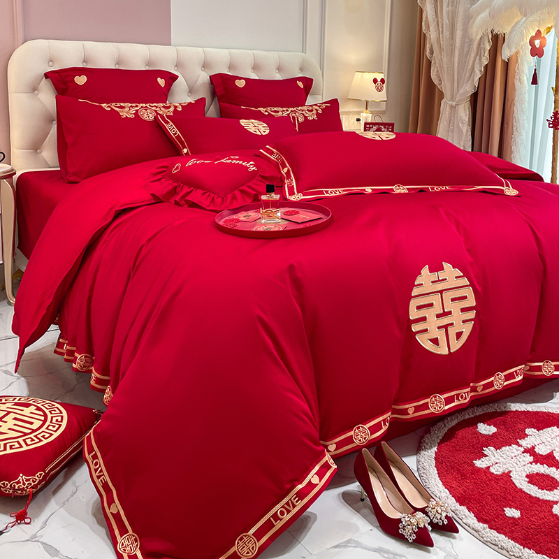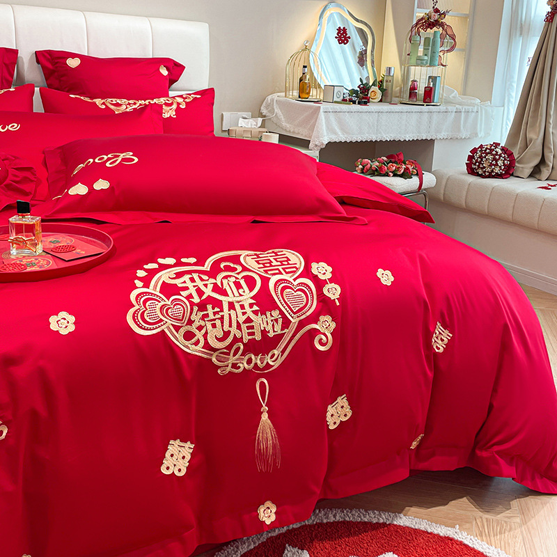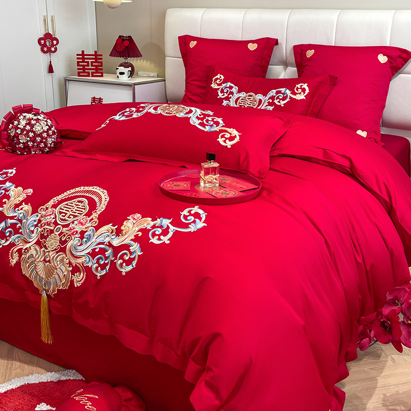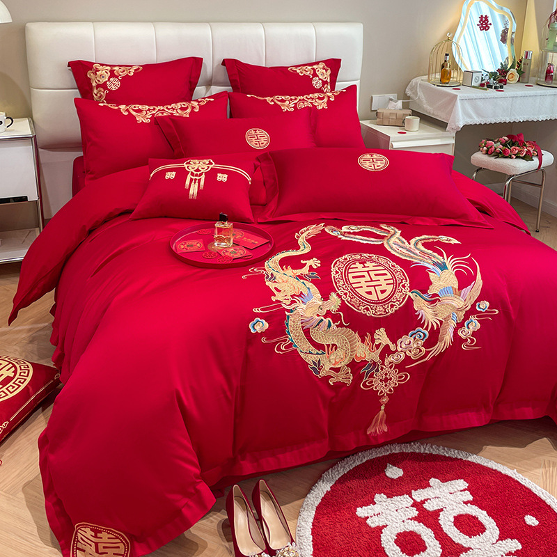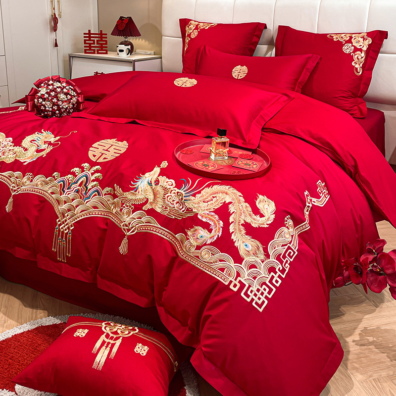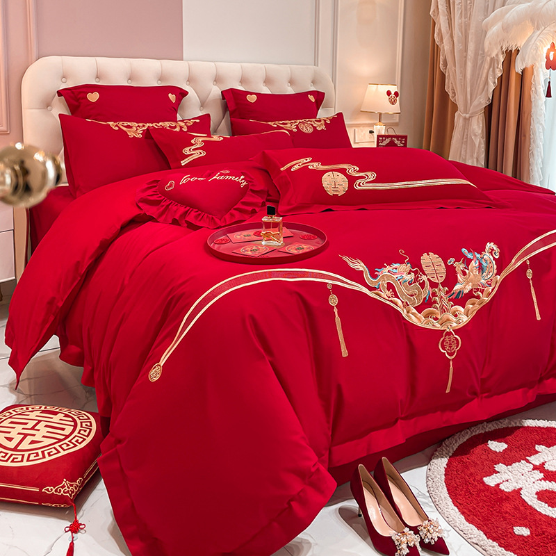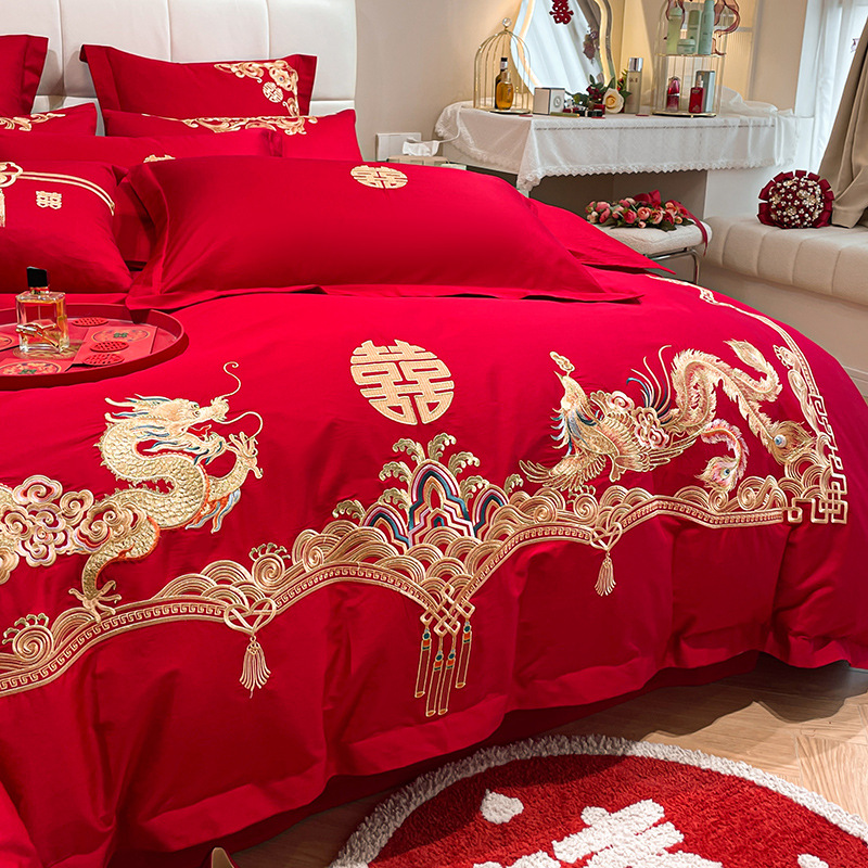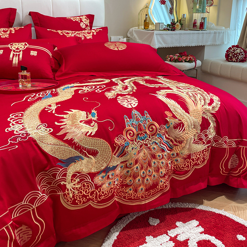 Новый приятный для кожи матовый свадебный набор из четырех предметов с вышивкой дракона и феникса праздничный красный простой свадебный номер постельное белье Свадебная Простыня