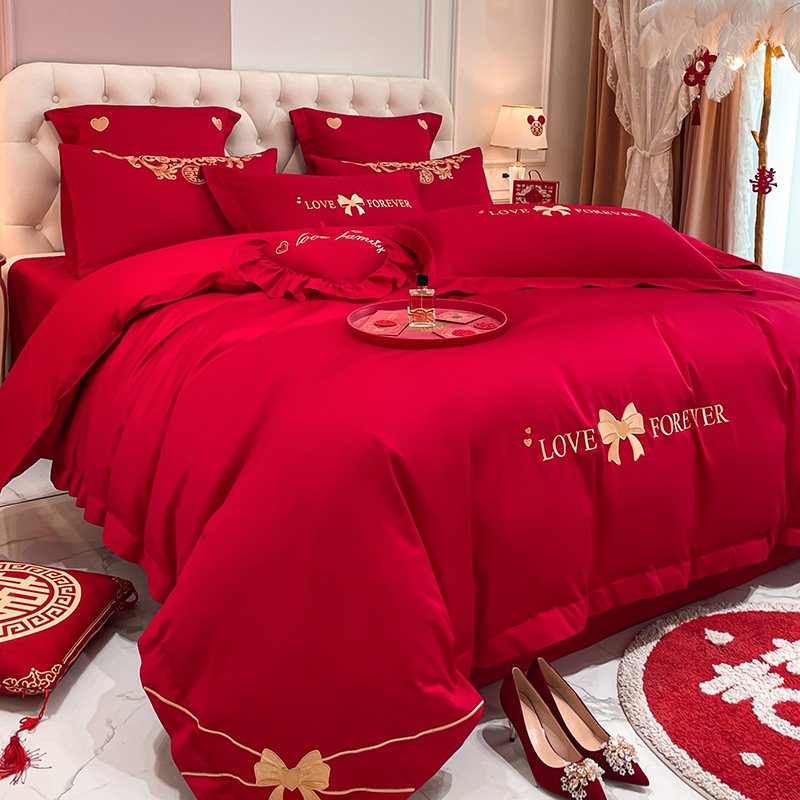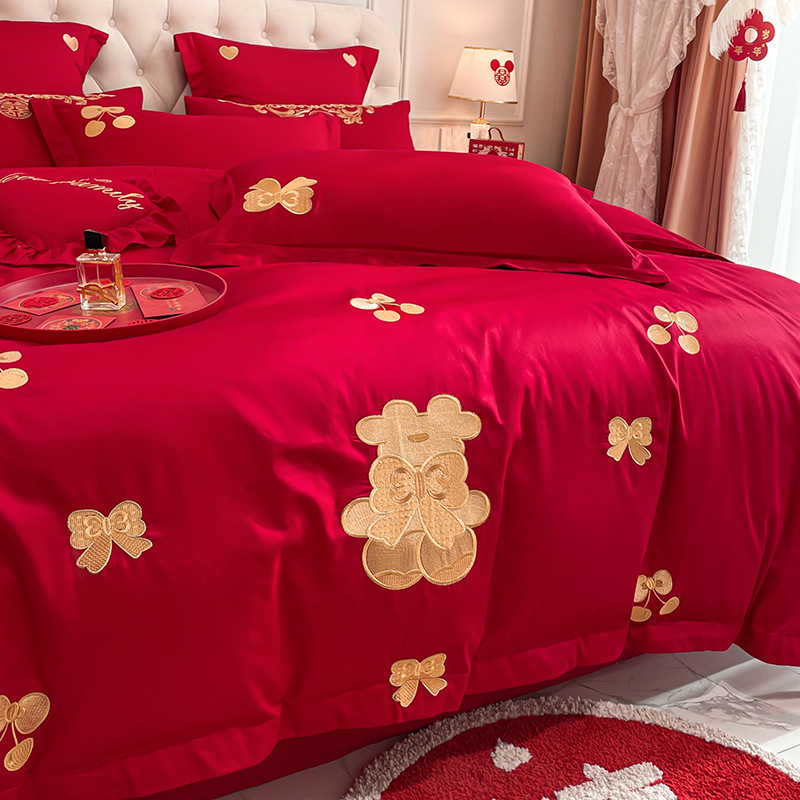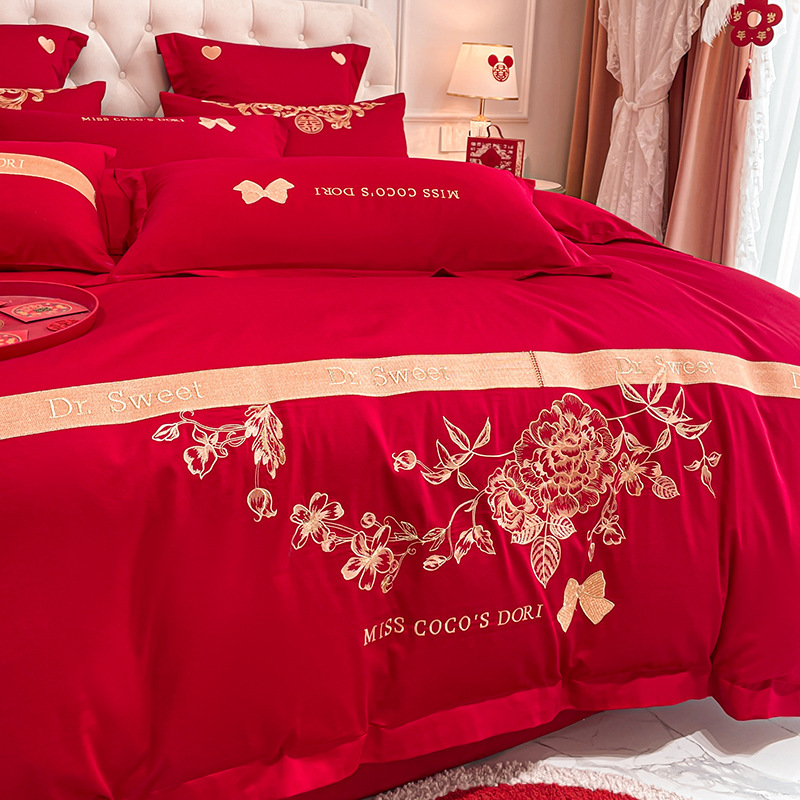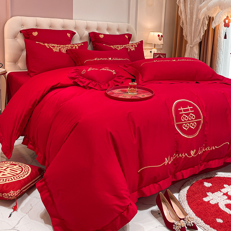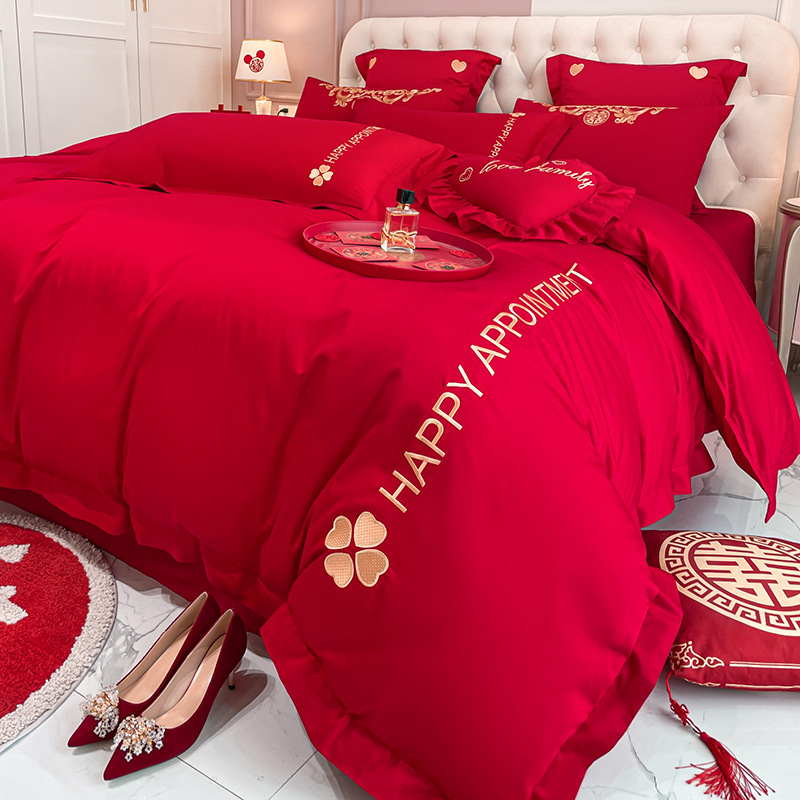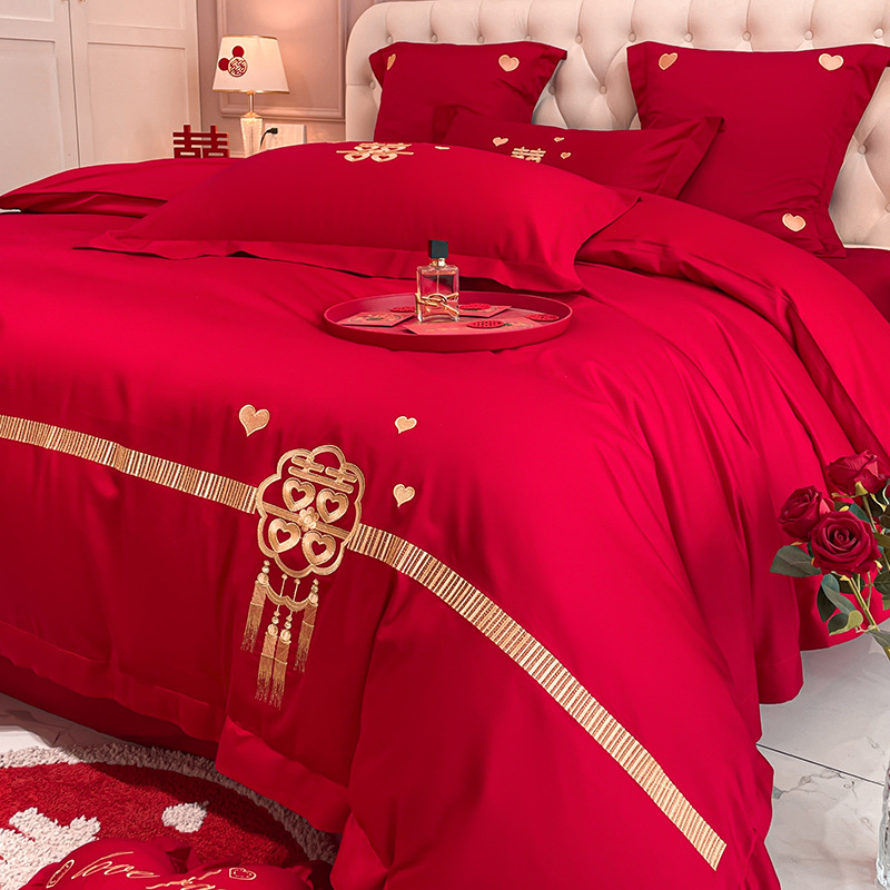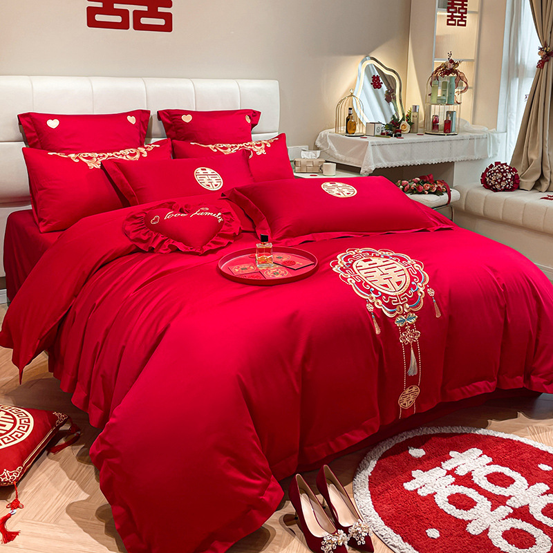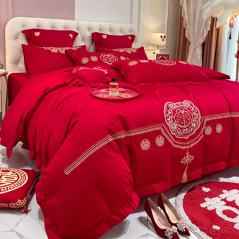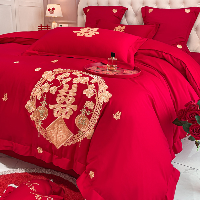 Новый приятный для кожи матовый свадебный набор из четырех предметов с вышивкой дракона и феникса праздничный красный простой свадебный номер постельное белье Свадебная Простыня