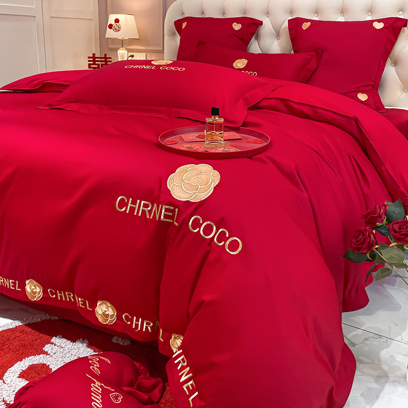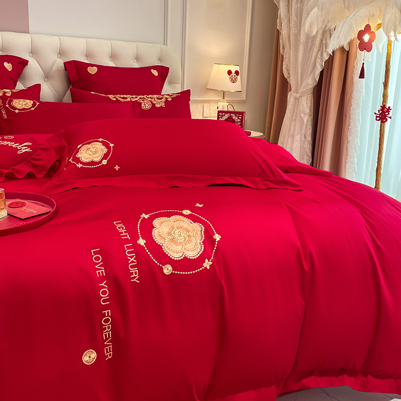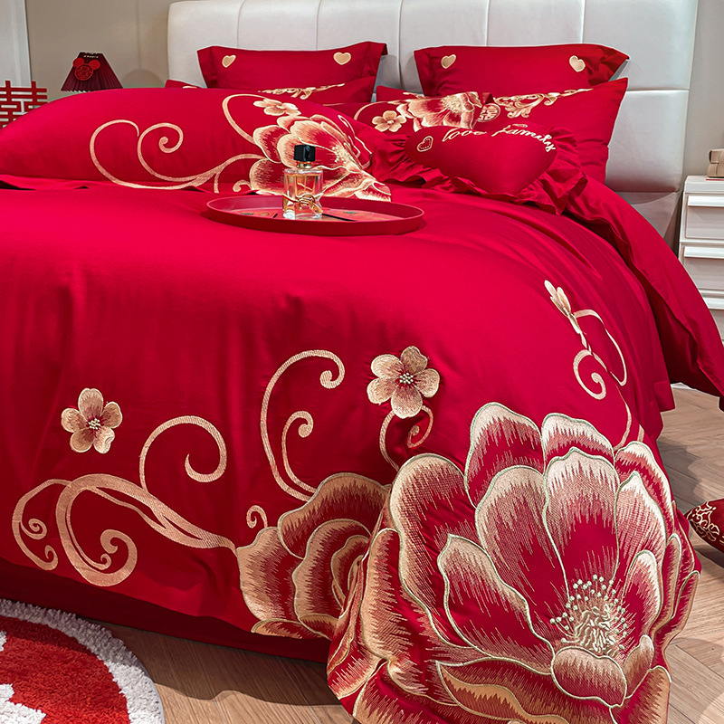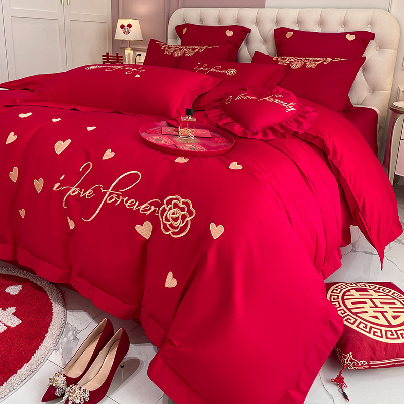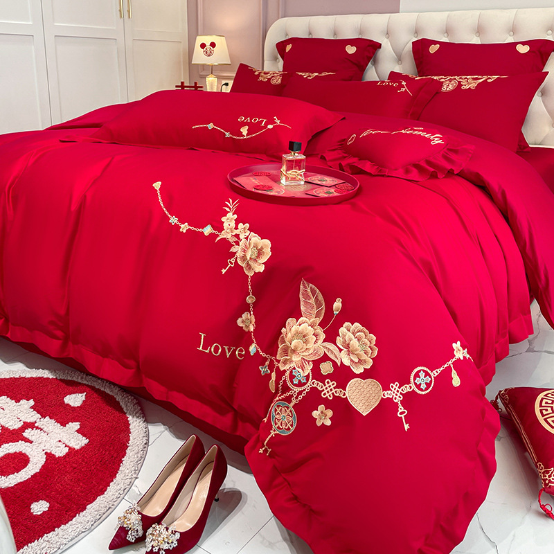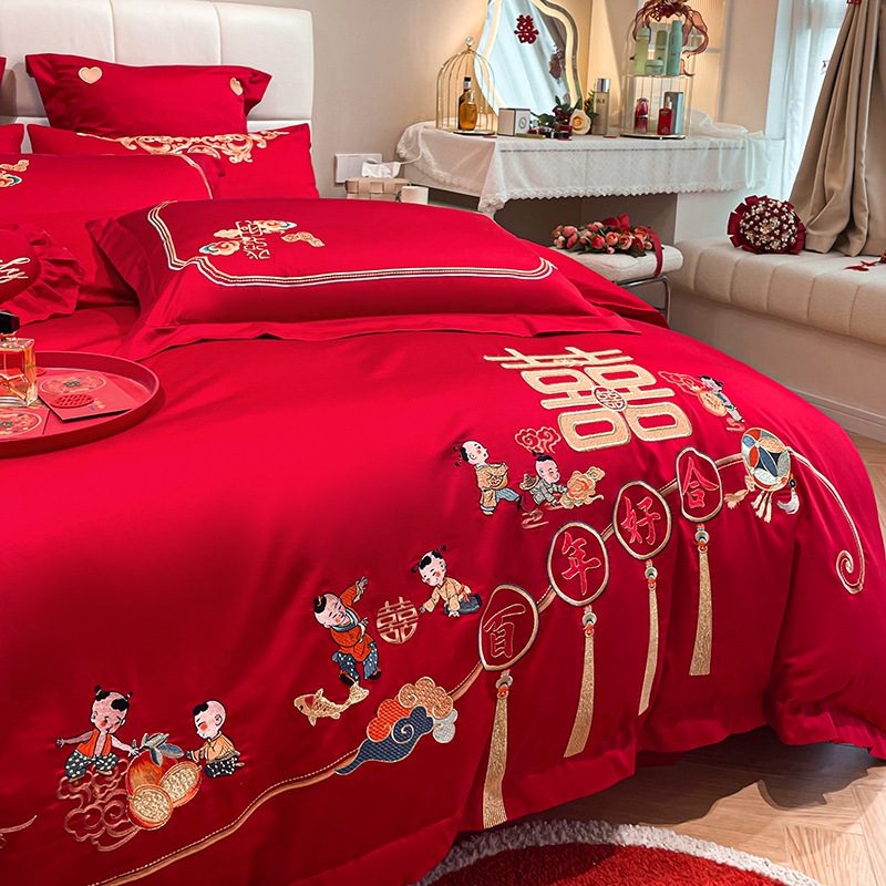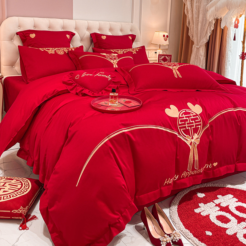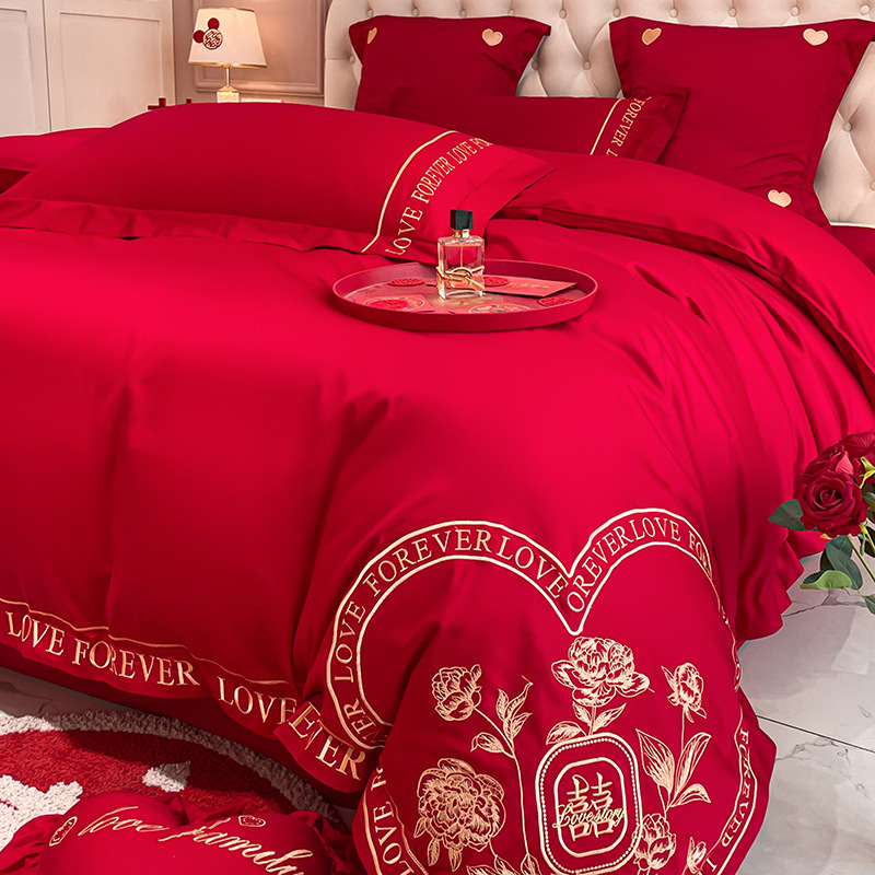 Новый приятный для кожи матовый свадебный набор из четырех предметов с вышивкой дракона и феникса праздничный красный простой свадебный номер постельное белье Свадебная Простыня