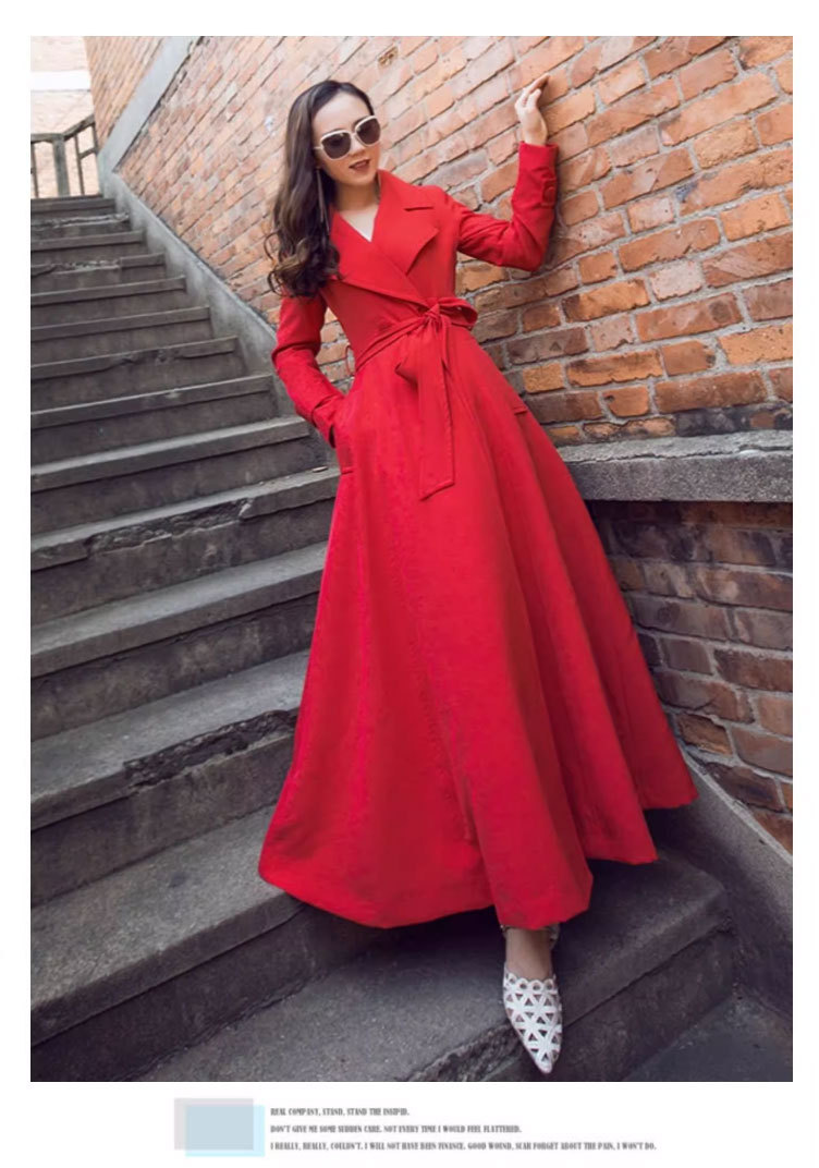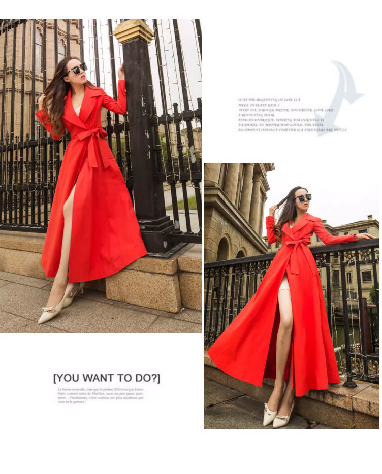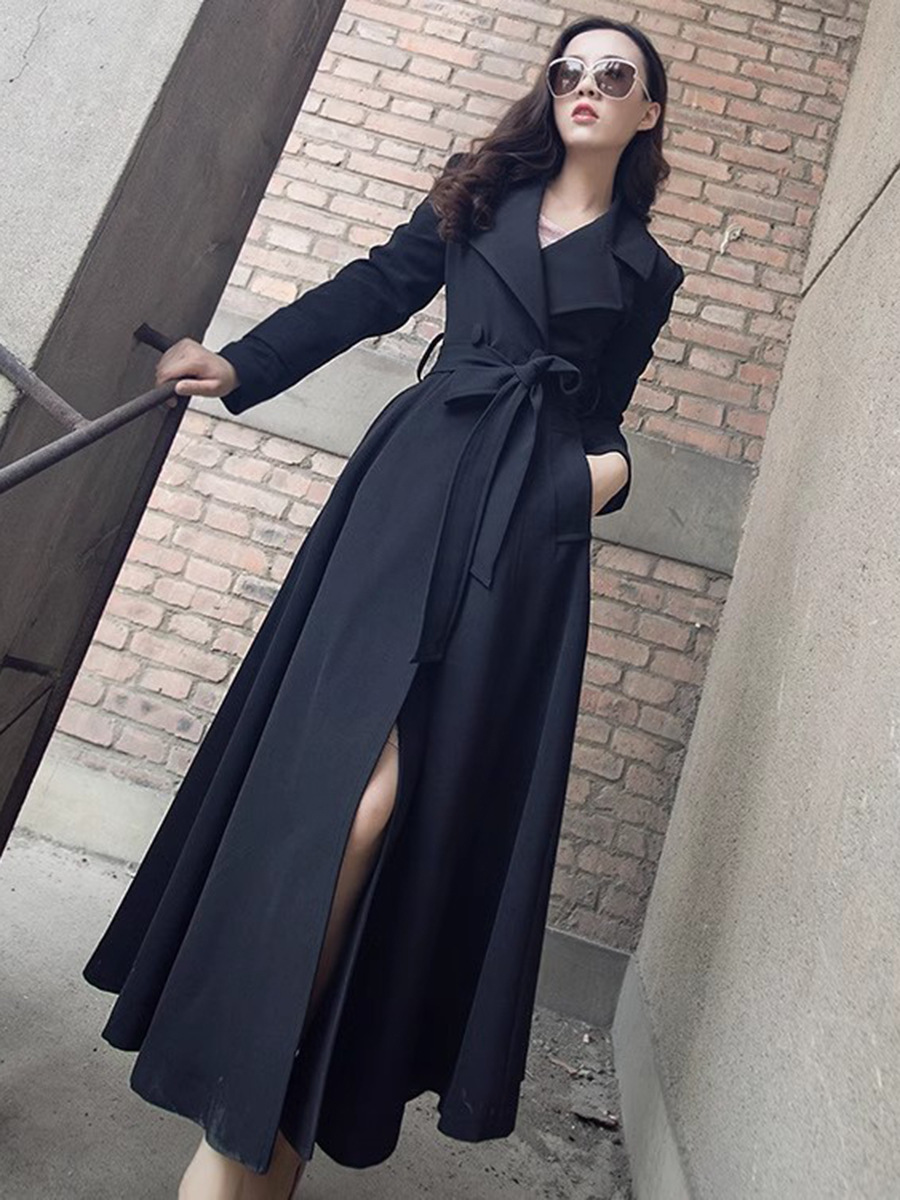 Весенне-осеннее пальто-тренч длиной до колена, приталенного силуэта, элегантное, удлиненное, с завязками на шнуровке и лацканами, больших размеров, с эффектом утягивания талии.