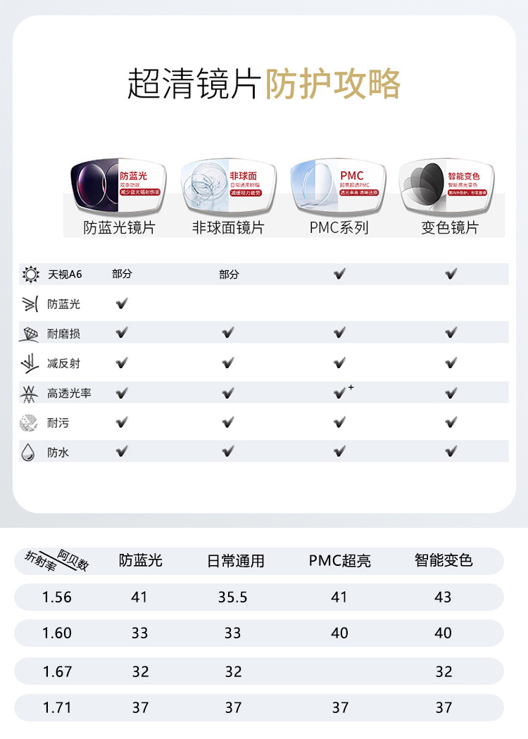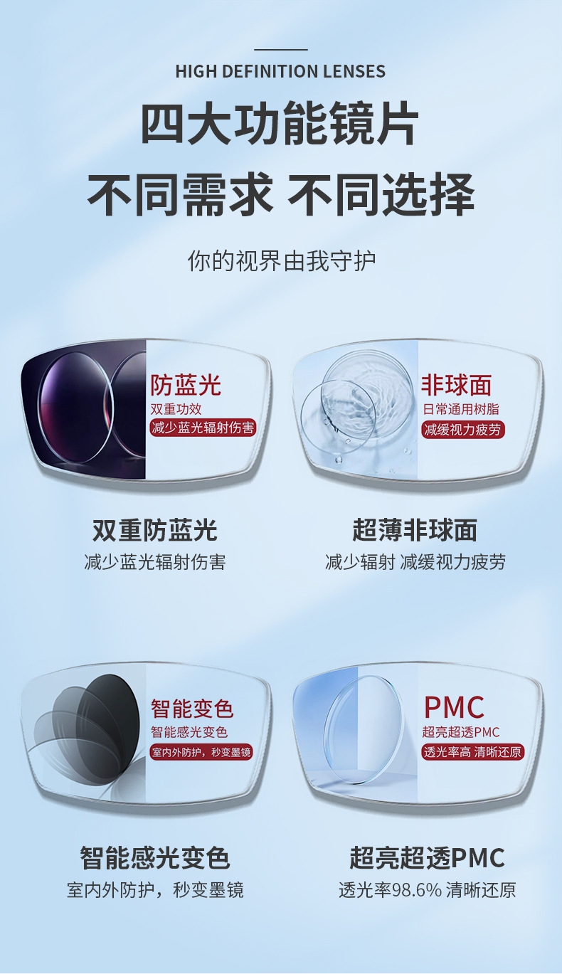 Универсальные линзы на каждый день.; Суперяркие линзы PMC; Линзы с защитой от синего света; Умные линзы, меняющие цвет; Сверхпрочная линза MR-8; Плата за обработку