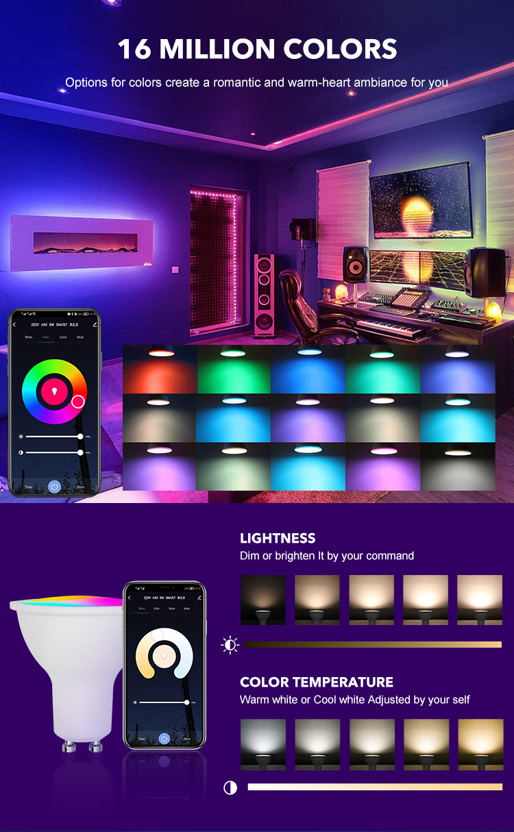 Светильник Tuya WiFi GU10RGBCW, полноцветный, с регулировкой яркости, голосовое управление, точечный светильник, поддержка Alexa, светодиодный, двойное подключение