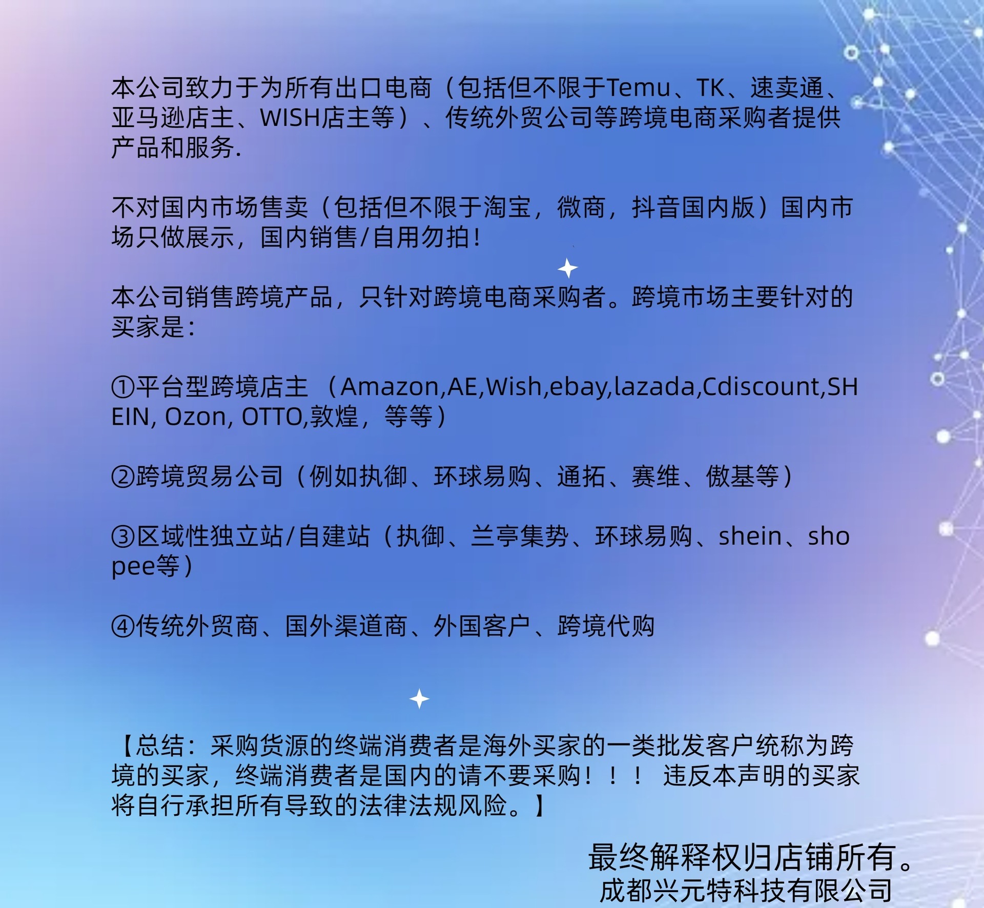 本公司销售跨境产品,只针对跨境电商采购者,不针对国内市场(只做展示),国内销售/自用勿拍!支持帮忙贴条码,打印箱唛. 开票另加税点.支持小批量定制.