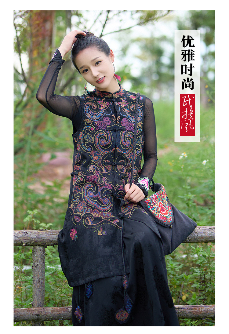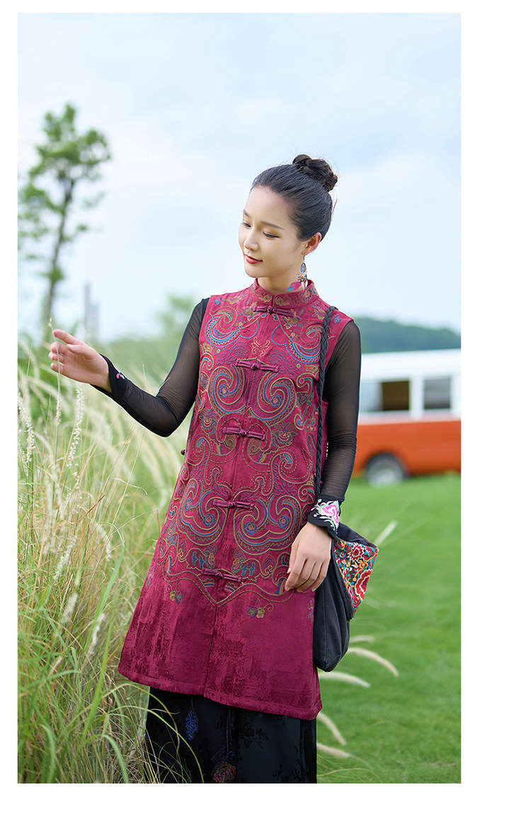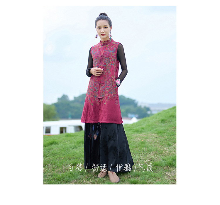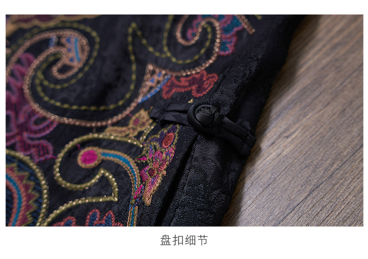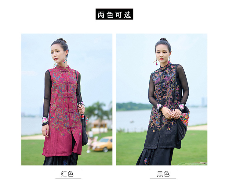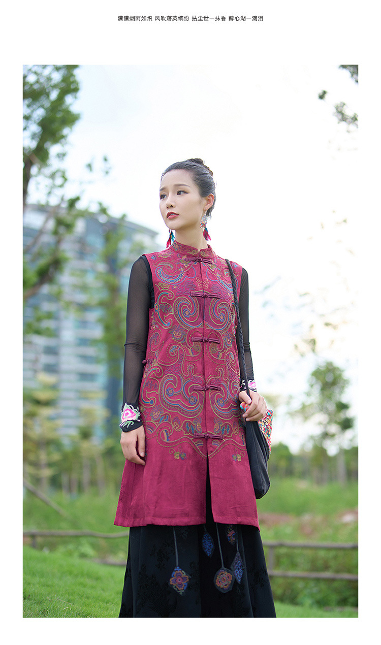 Новый женский этнический стиль воротник-стойка вышитый жилет средней длины без рукавов воротник-стойка с пряжкой вышитый жилет