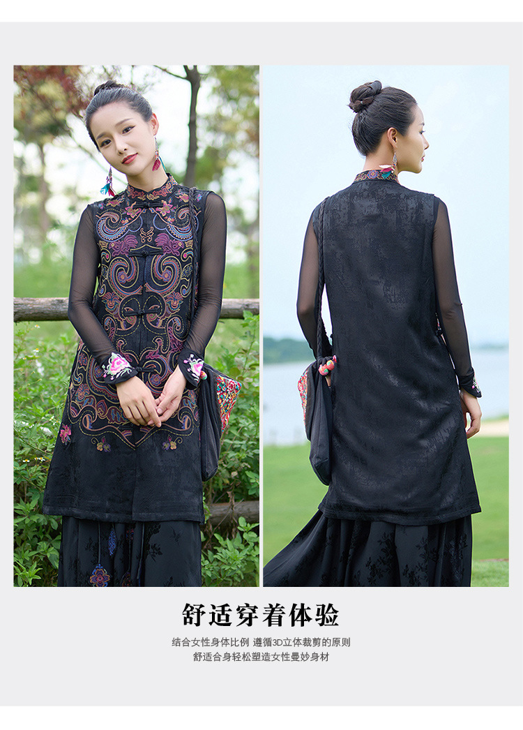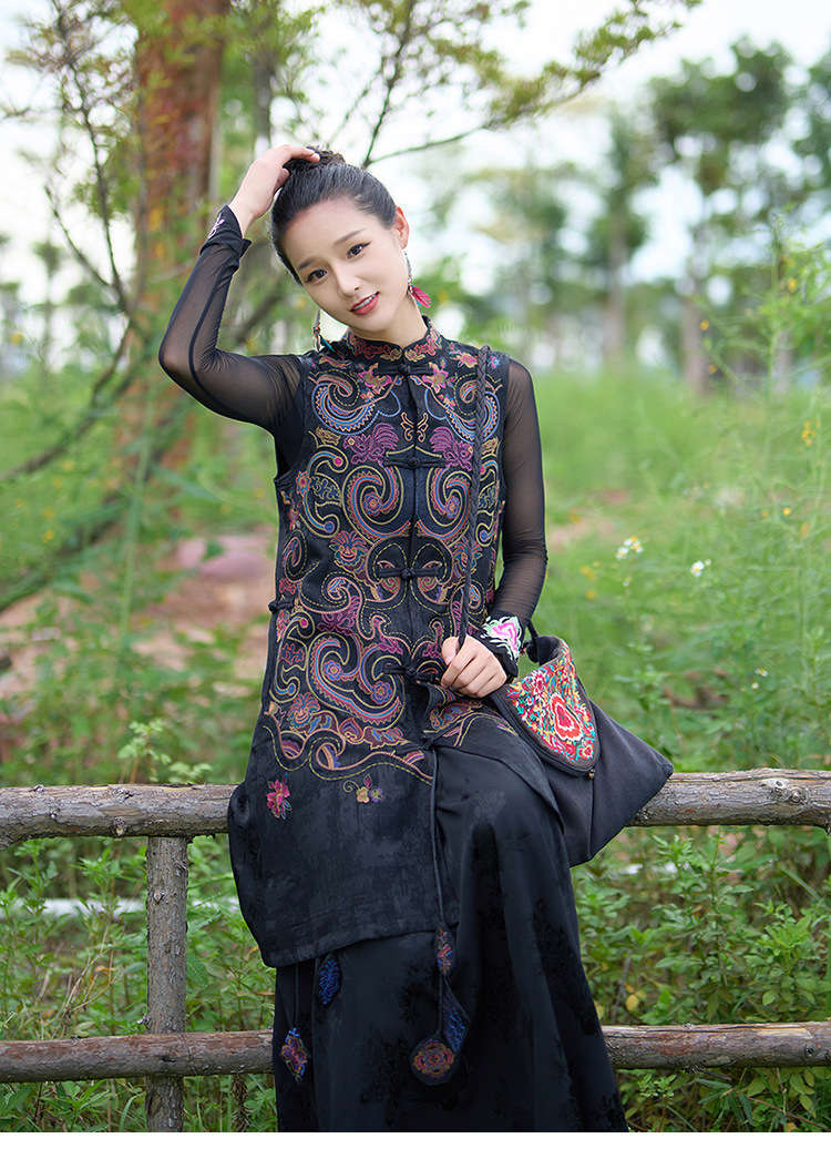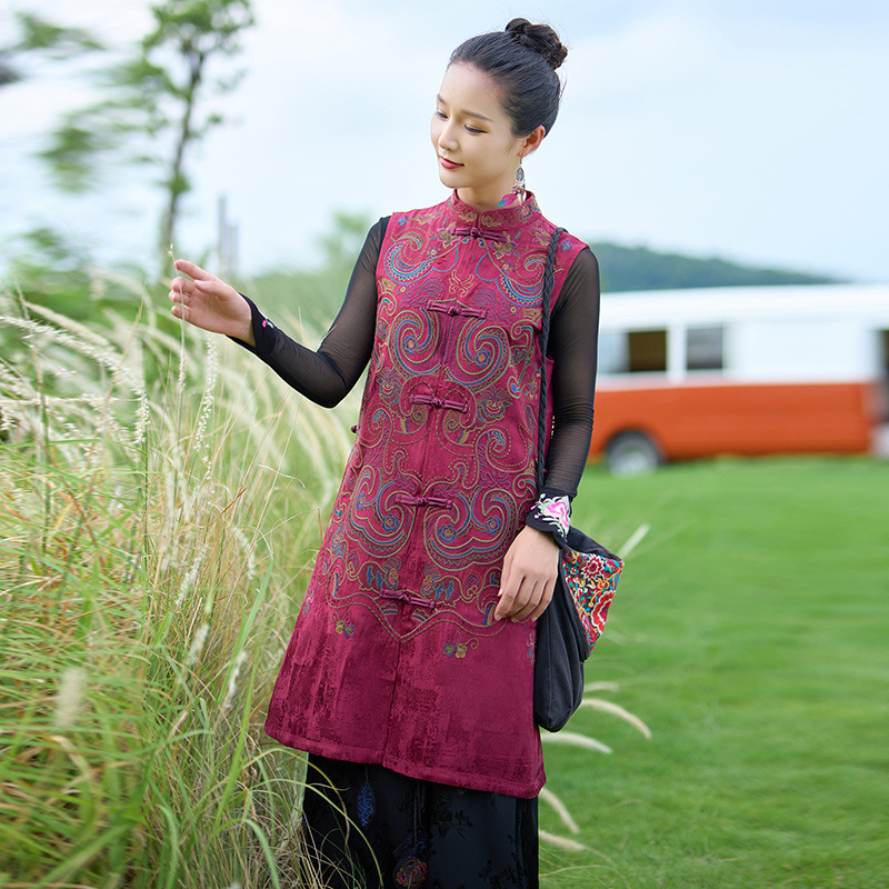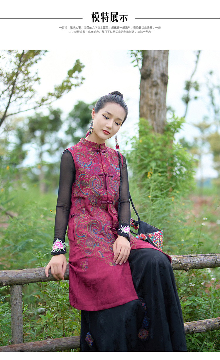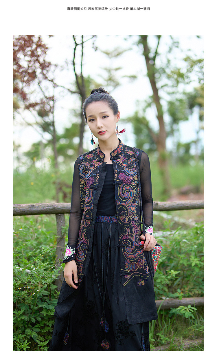 Новый женский этнический стиль воротник-стойка вышитый жилет средней длины без рукавов воротник-стойка с пряжкой вышитый жилет