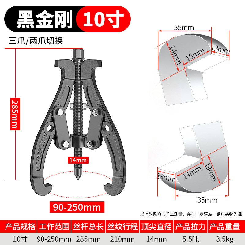 3inch Съемник 75 мм (переключаемый с тремя захватами/двумя захватами) 50 комплектов/шт., 0,37 кг/комплект; 4inch Съемник 100 мм (переключаемый с тремя/двумя захватами) 40 комплектов/шт., 0,77 кг/комплект; 6inch Съемник 150 мм (переключаемый с тремя захватами/двумя захватами) 20 комплектов/шт., 1,32 кг/комплект; 8inch Съемник 200 мм (переключаемый с тремя захватами/двумя захватами) 16 комплектов/шт., 1,74 кг/комплект; 10inch Съемник 250 мм (переключаемый с тремя/двумя захватами) 8 комплектов/шт., 3,23 кг/комплект; 12inch Съемник 300 мм (переключаемый с тремя/двумя захватами) 6 комплектов/шт., 3,36 кг/комплект; 14inch Съемник 350 мм (переключаемый с тремя/двумя захватами) 4 комплекта/шт., 5,75 кг/комплект; 16inch Съемник 400 мм (переключаемый с тремя/двумя захватами) 4 комплекта/шт., 8,21 кг/комплект; 20inch Съемник 500 мм (только для трехзахватов) 3 комплекта/шт., 10,55 кг/комплект; 28inch Съемник 700 мм (только для трехзахватного) 1 комплект/шт., 19,55 кг/комплект