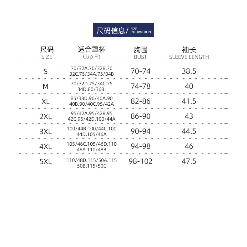 S(70-74); М (74-78); Л (78-82); XL(82-86); 2XL(86-90); 3XL(90-94); 4XL(94-98); 5XL(98-102)