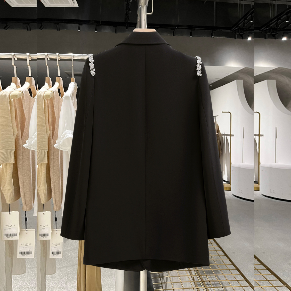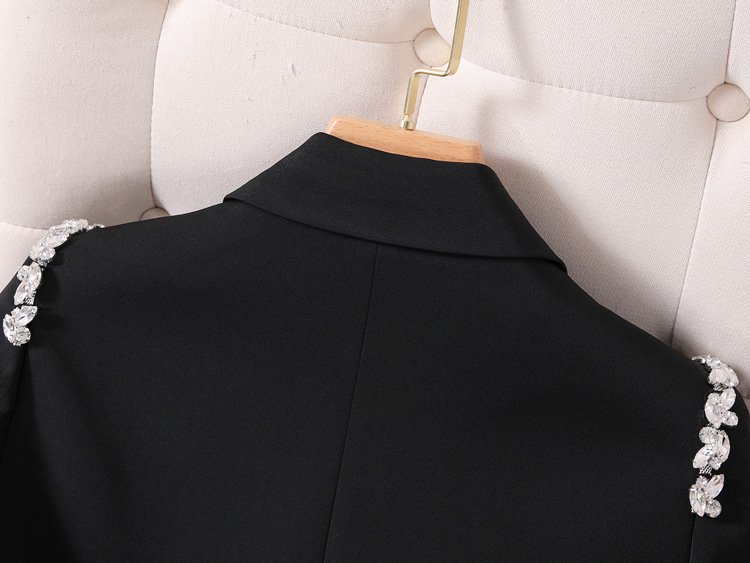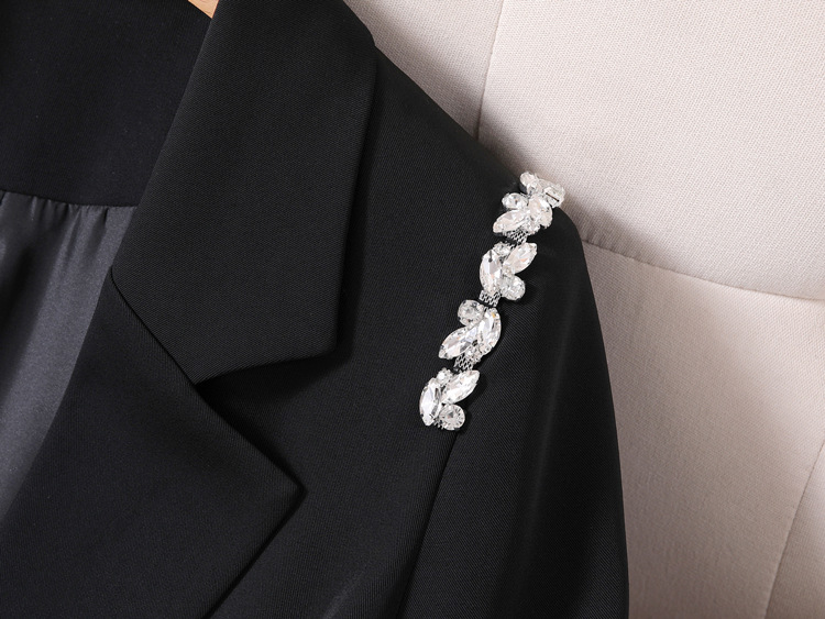 此西装肩部采用铜珠链手工钉制
