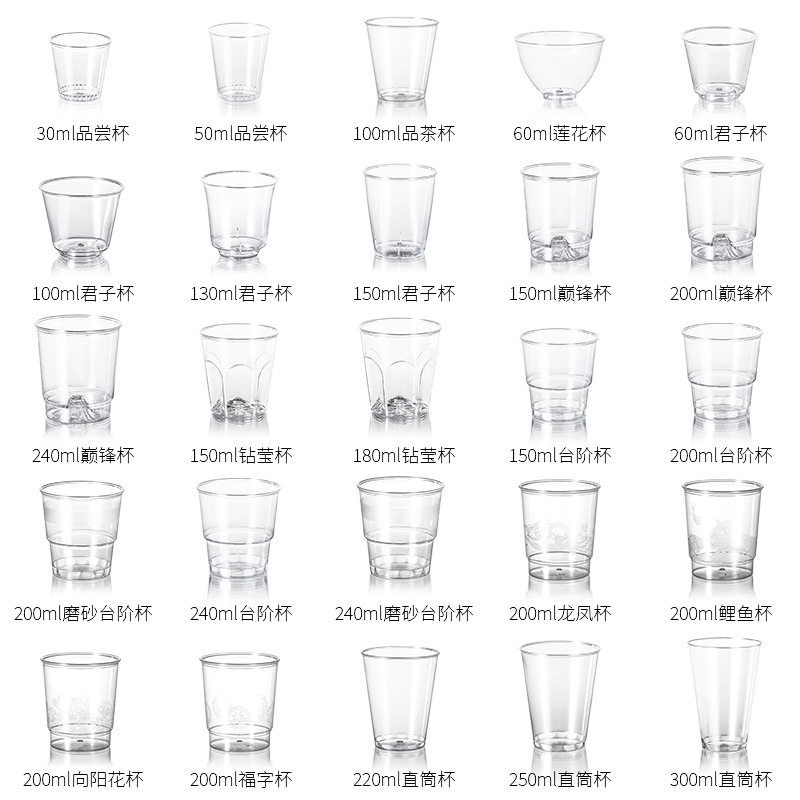 30ml Дегустационный стакан; 50ml Дегустационный стакан; 130ml Джентльменский кубок одиночный; 150ml Джентльменский кубок одиночный; 150ml Пик Кубок одиночный; 150ml Diamond Ying Cup; 150ml ступенчатая чашка одиночный; 180ml Diamond Ying Cup; 200ml Пик Кубок одиночный; 200ml ступенчатая чашка одиночный; 200ml матовая ступенчатая чашка одиночный; 200 мл Чашка «Восьмь Сокровищ» - Одиночная; 220ml прямой стакан одиночный; 220 мл алмазная чашка, одиночная; 240ml Пик Кубок одиночный; 240ml матовая ступенчатая чашка одиночный; 240ml ступенчатая чашка одиночный; 250ml прямой стакан одиночный; 300ml прямой стакан один; 300 мл алмазная чашка, одиночная
