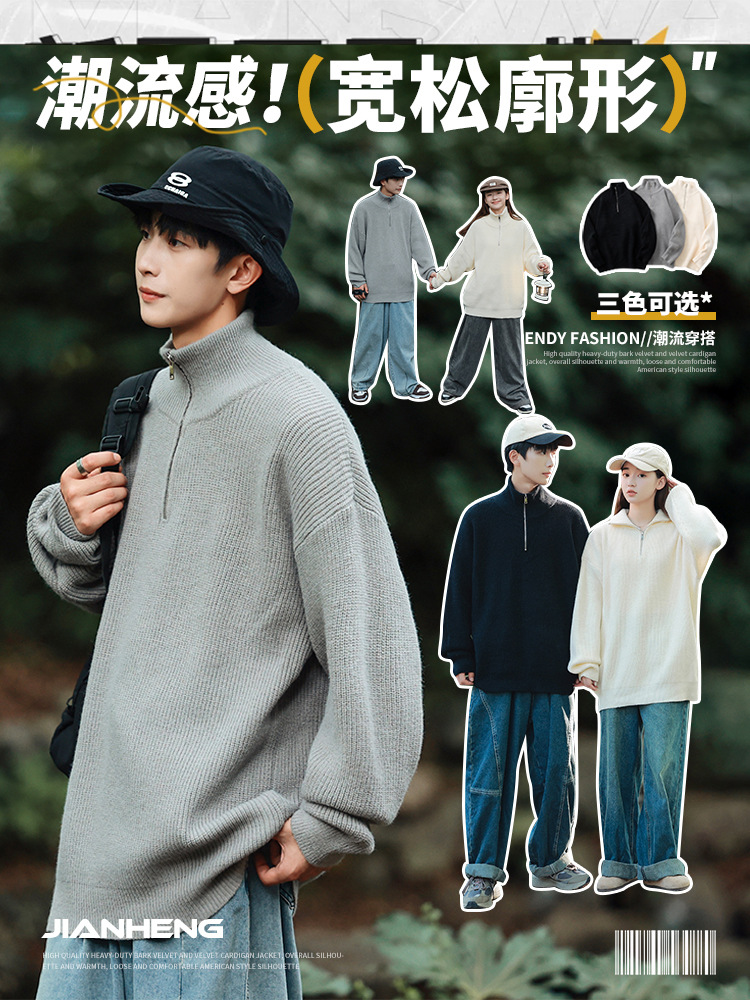 Jian Heng новый мужской свитер простой пара ленивый ветер чистый цвет мужской свитер на молнии