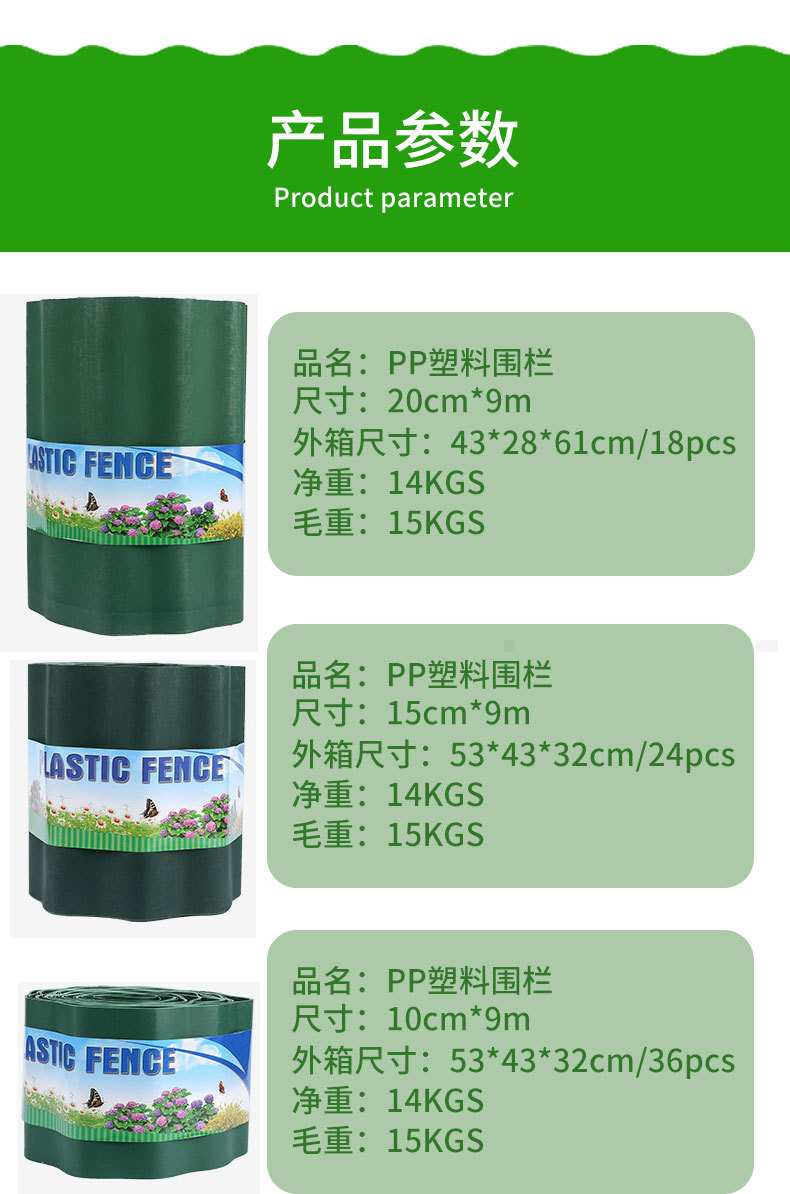 绿色护栏尺寸20X9m 外箱尺寸:56X29X61cm 18个一箱