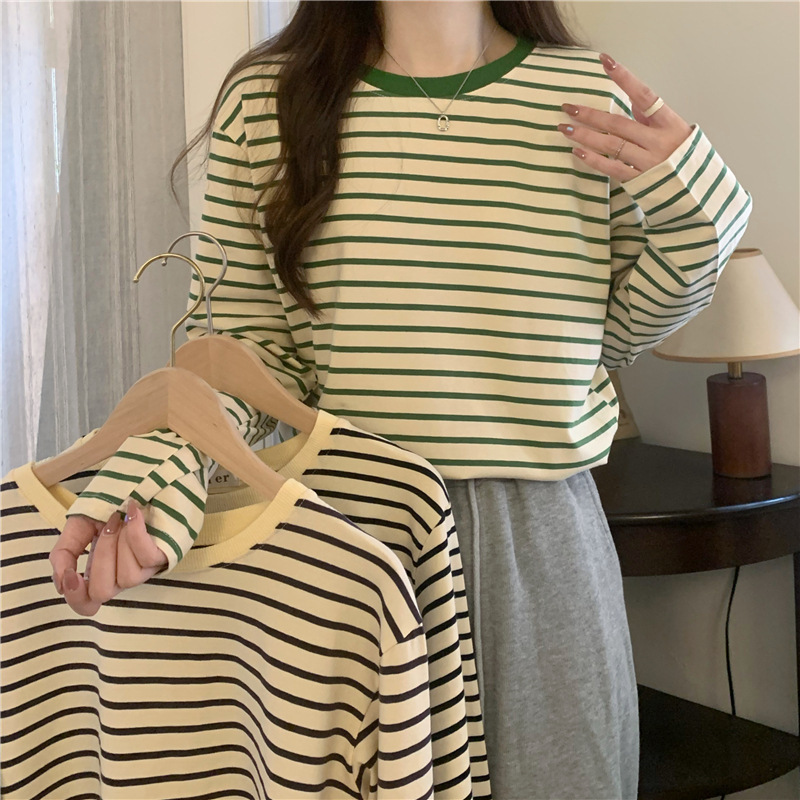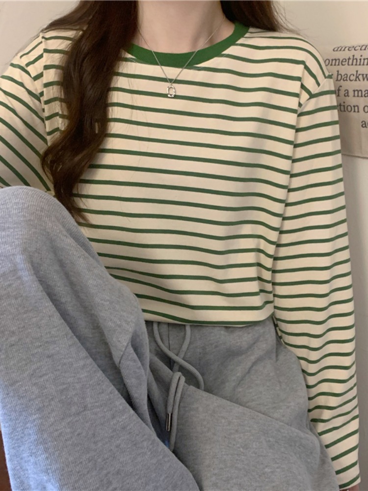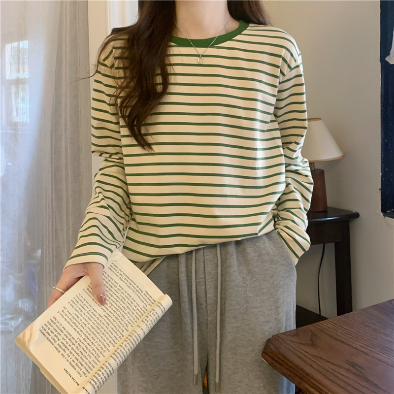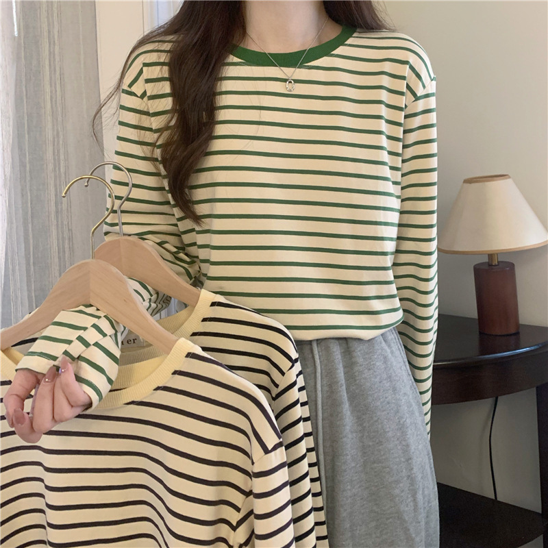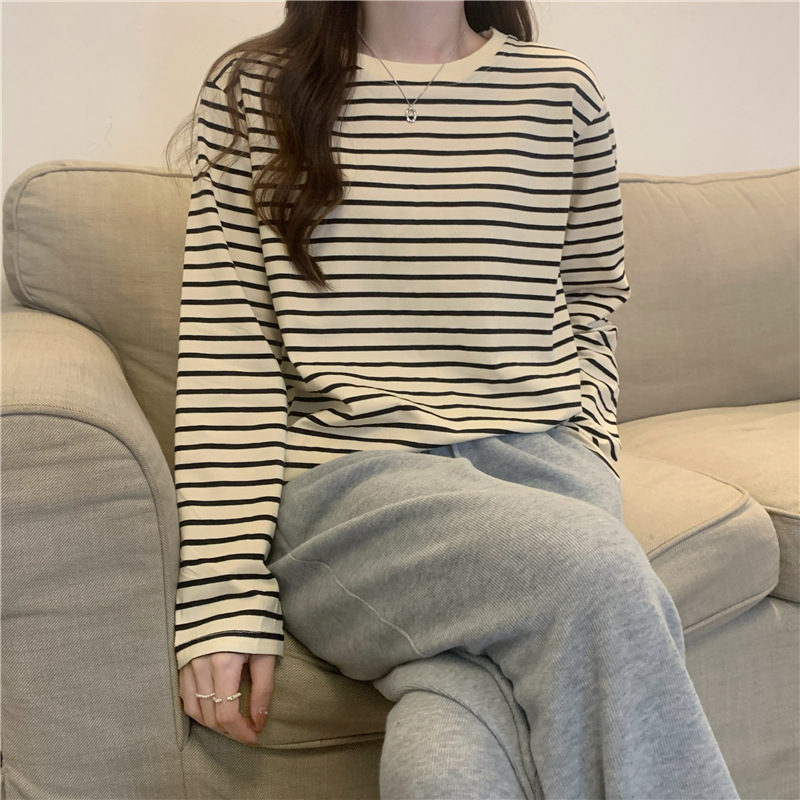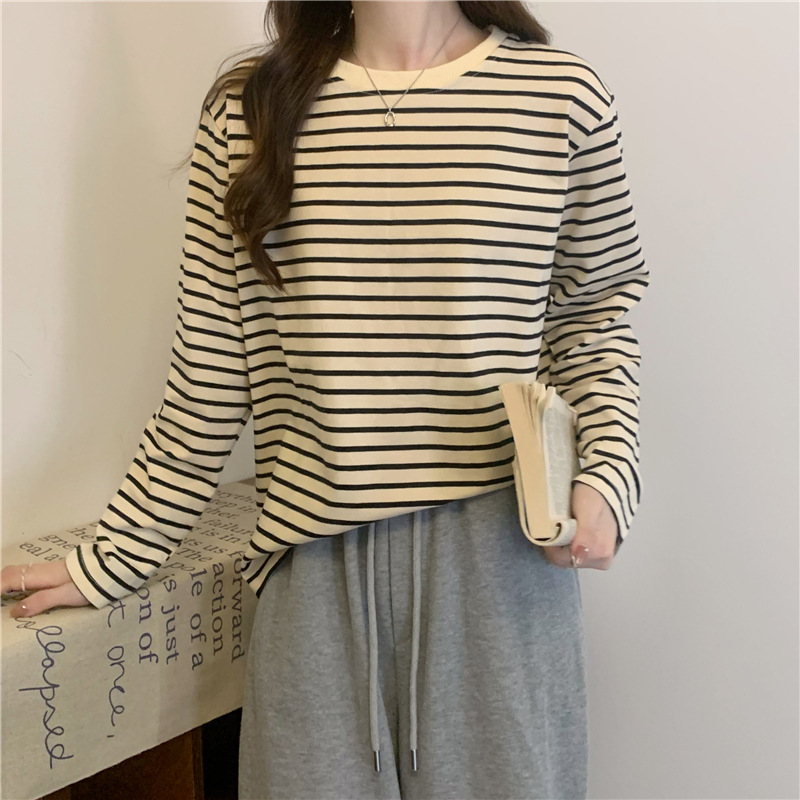 В наличии 2024 Ранняя весна новая свободная универсальная облегающая черно-белая полосатая нижняя рубашка тонкая футболка с круглым вырезом и длинным рукавом для женщин