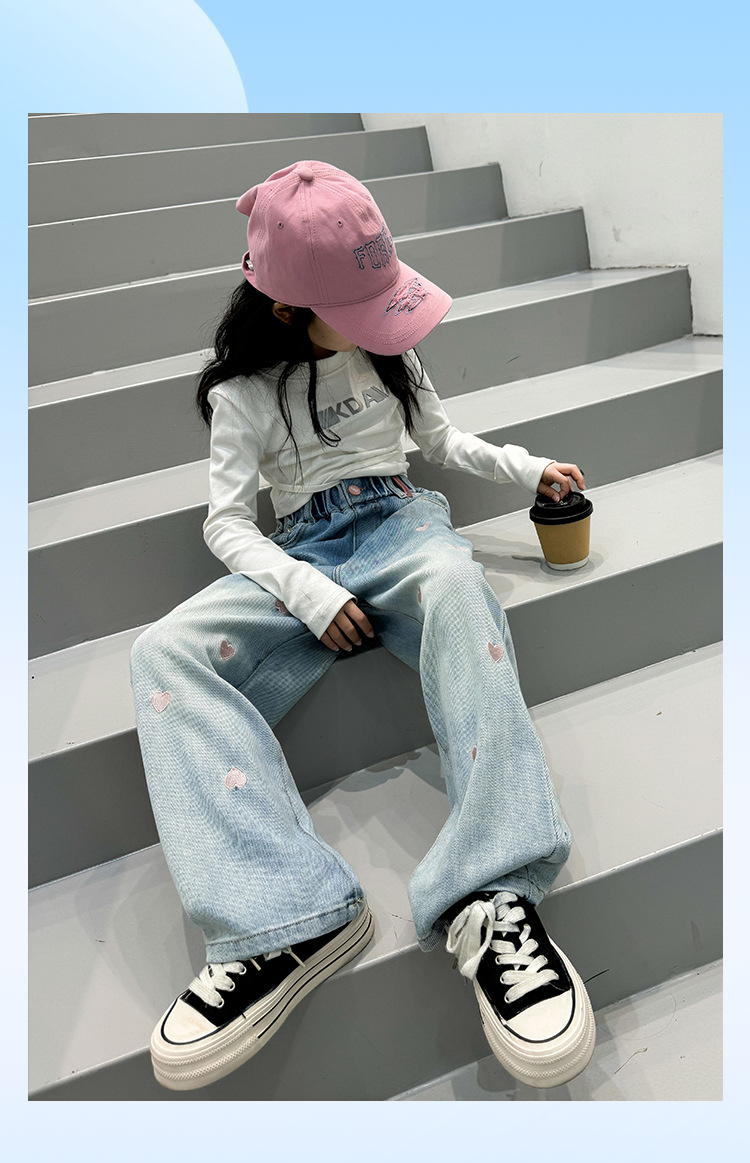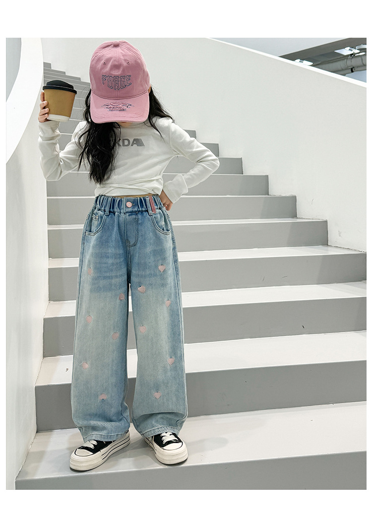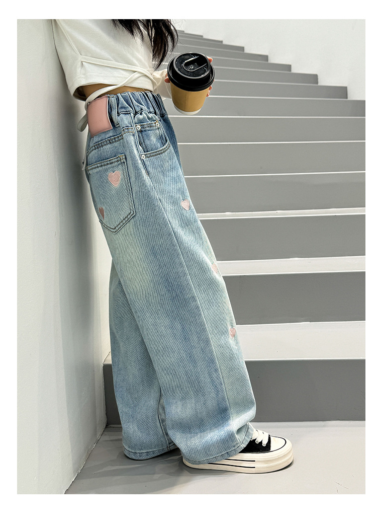 Брюки для девочек, весна-осень 2025, модные повседневные утягивающие брюки с вышивкой в виде сердца для детей старшего возраста, узкие джинсовые широкие брюки