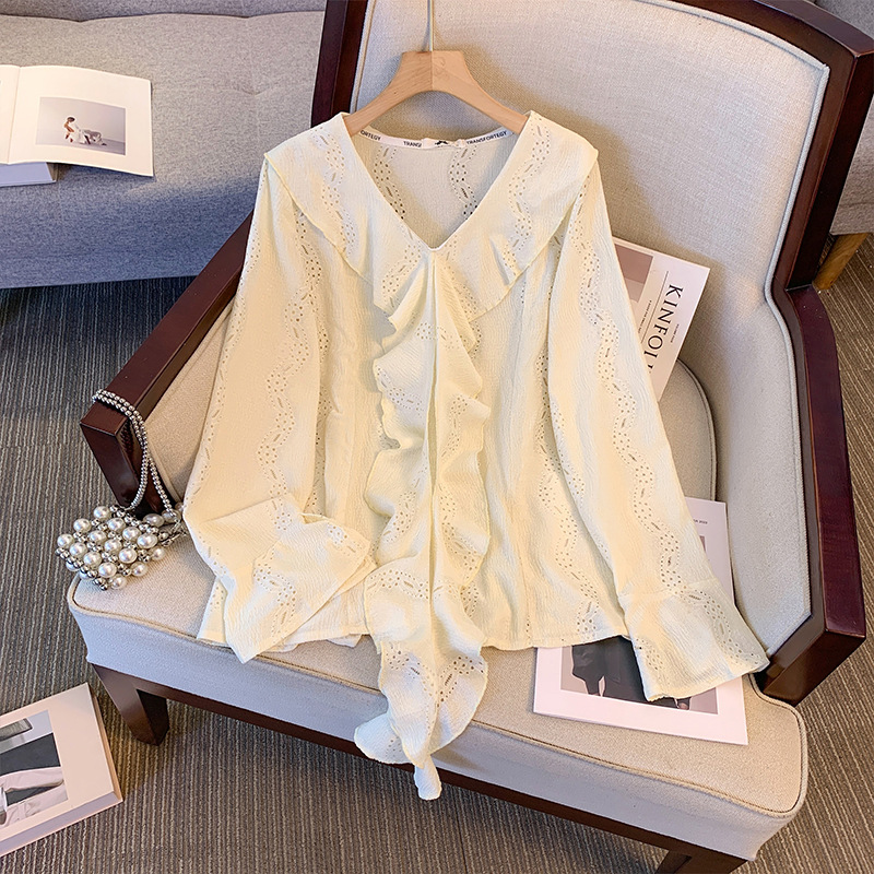 Политика деформации женская одежда больших размеров, кружевная шифоновая рубашка с длинными рукавами для круглых девочек, весенне-летний дизайн, нишевый жаккардовый полый топ