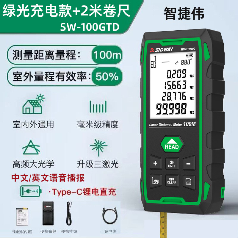SW-GTD50 зеленый свет 50m (прямая зарядка литиевой батареи) + 2m рулетка на китайском и английском языках; SW-GTD70 зеленый свет 70m (прямая зарядка литиевой батареи) + 2m рулетка на китайском и английском языках; SW-GTD100 зеленый свет 100m (прямая зарядка литиевой батареи) + 2m рулетка на китайском и английском языках; Лазерный уровень SW-GTL50 с зеленым лучом, перекрестной линией и измерительной лентой (китайский/английский); Лазерный уровень SW-GTL70 с зеленым лучом, перекрестной линией и измерительной лентой (китайский/английский); Лазерный уровень SW-GTL100 с зеленым лучом, перекрестной линией и измерительной лентой (китайский/английский)