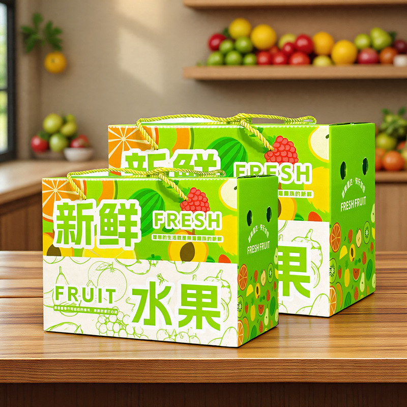 Чемодан для свежих фруктов — средний размер; трехслойный гофрокартон с зеленым принтом; Чемодан для свежих фруктов — большой размер; трехслойный гофрокартон с зеленой печатью
