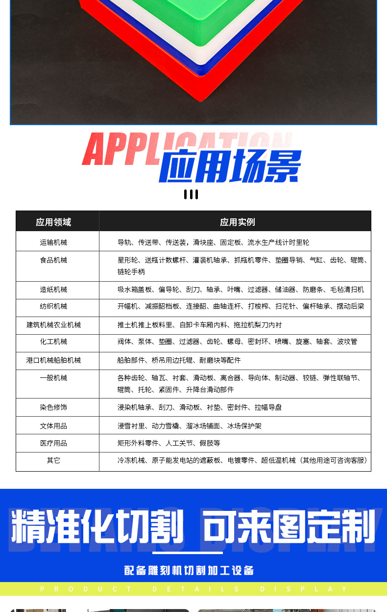 Компоненты медицинского оборудования, уплотнения, разделочные доски, раздвижные профили, машиностроение, химическая промышленность, электричество, одежда, упаковочная, пищевая и другие отрасли промышленности.