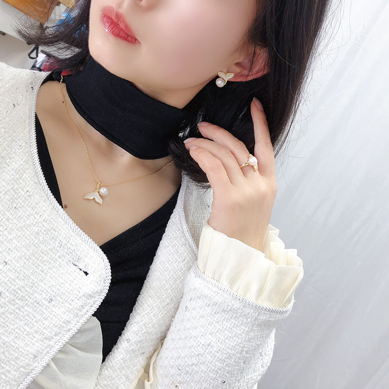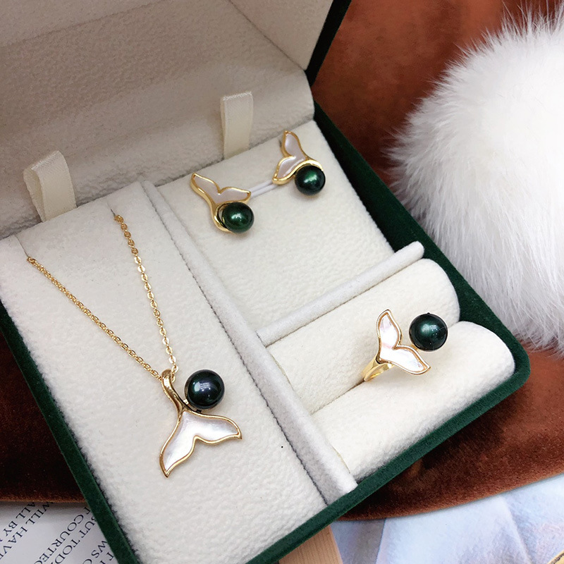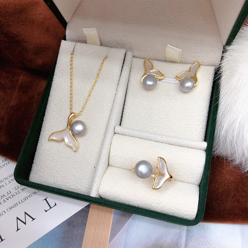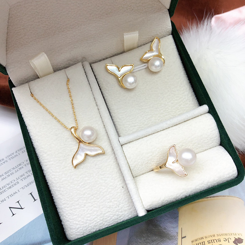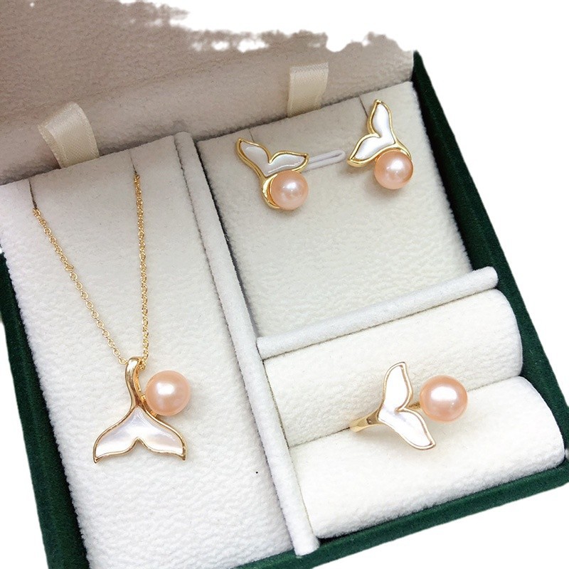 Пресноводный жемчужный ожерелье набор из трех частей моллюсков рыбий хвост комплект серьги кольцо 7-8 мм классический минималистский орнамент