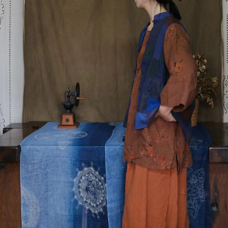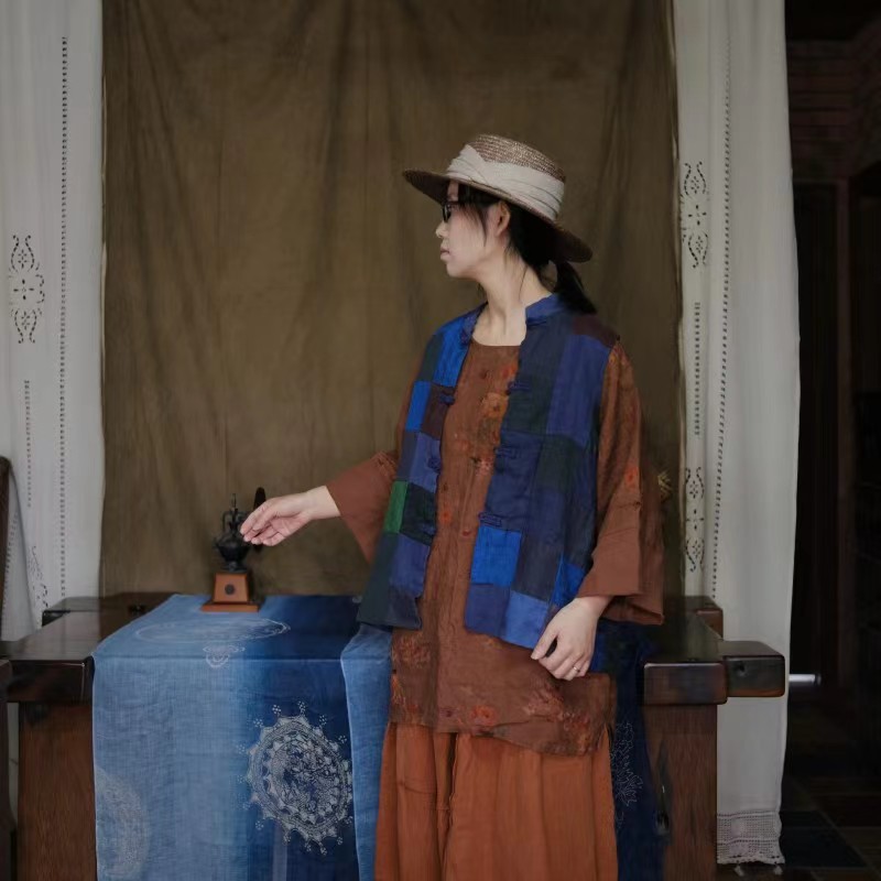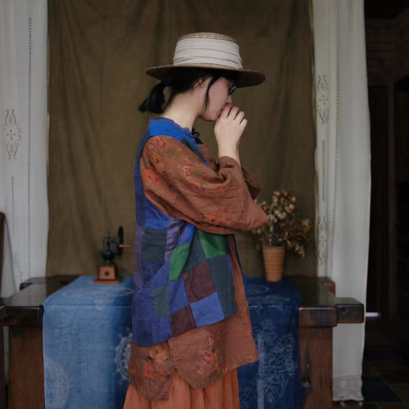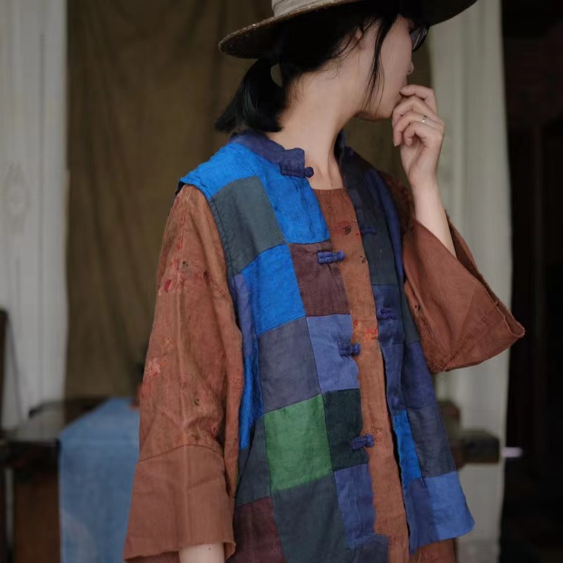 Весенний винтажный льняной лоскутный двубортный жилет на подкладке в стиле грязного нищего 2032 с синей нашивкой.