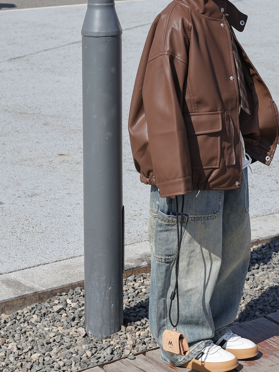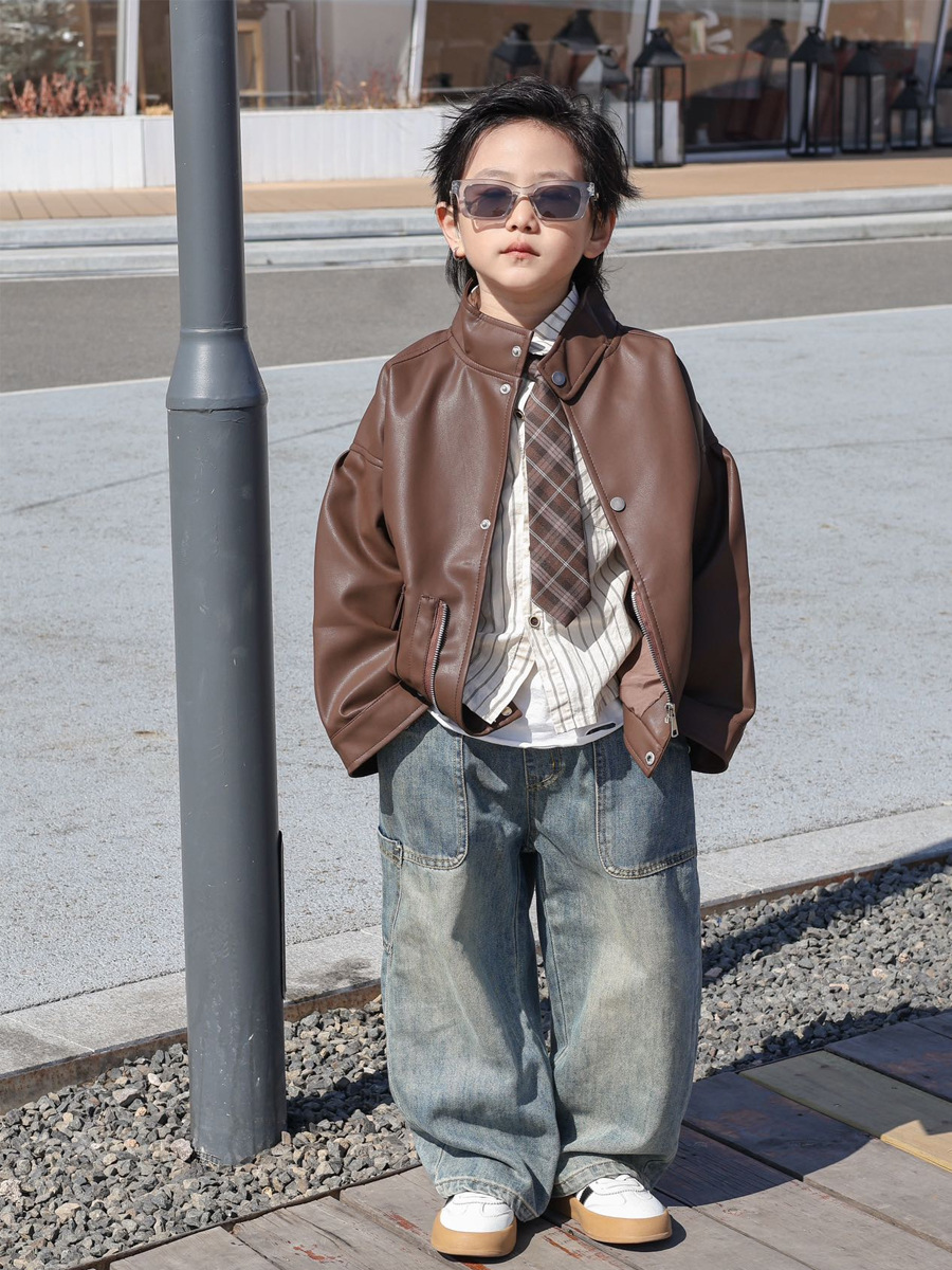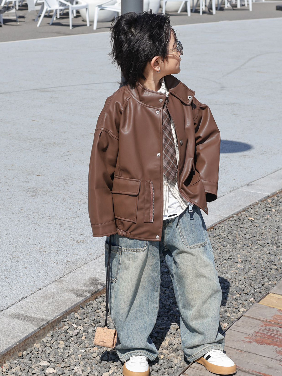 Детская кожаная куртка на флисовой подкладке, зима 2025, новый стиль, для мальчиков и девочек, кожаная куртка с лацканами, байкерская куртка в корейском стиле для мальчиков