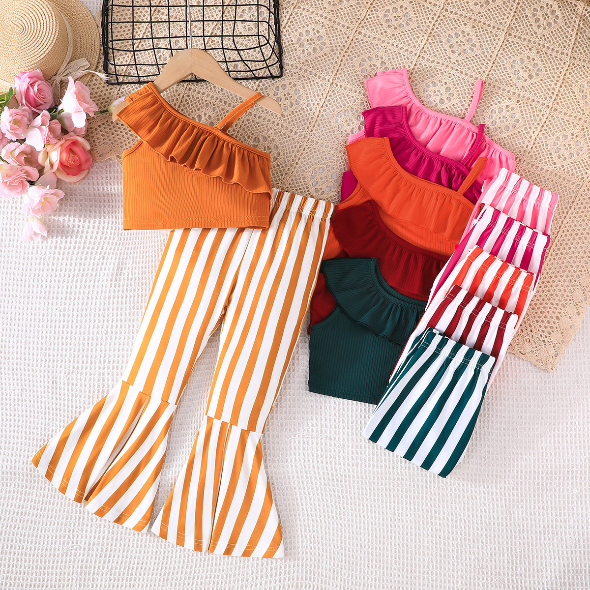 Топ с рюшами на бретельках для девочек + полосатый костюм-клеш, новый летний повседневный модный костюм