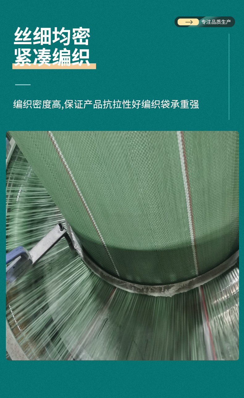 3、本公司编织袋主要为绿色编织袋、防水编织袋、覆膜编织袋、加厚编织袋、特大编织袋、特长编织袋、搬家袋、建筑垃圾袋、编织布卷、包材等系列产品可根据客户要求定制,欢迎咨询客服选购!