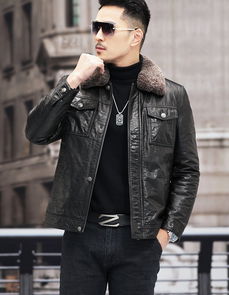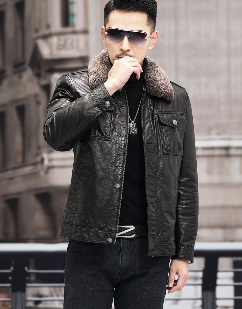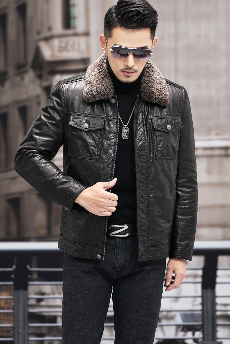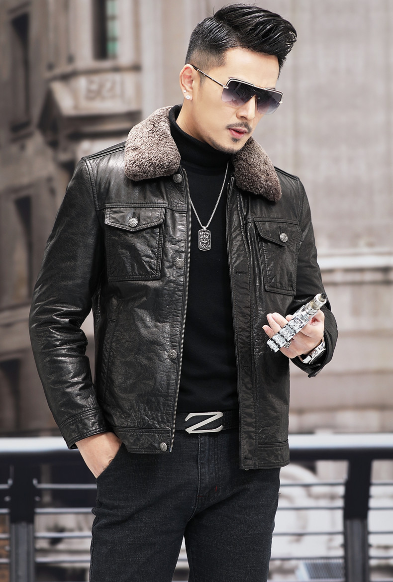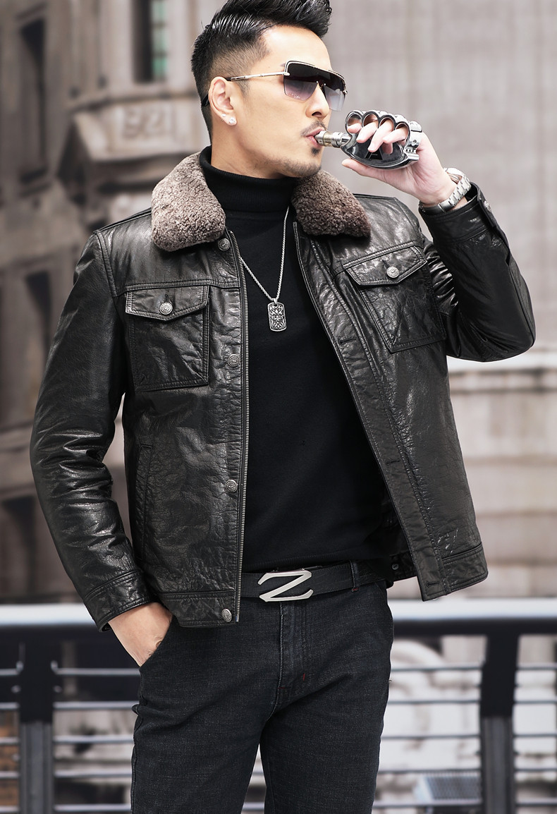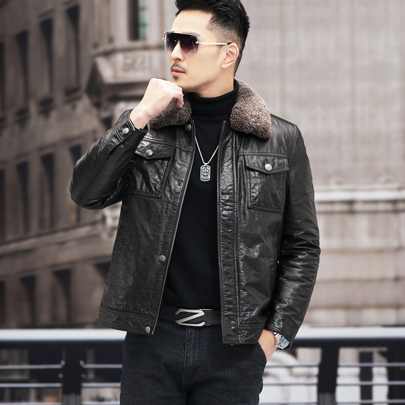 Мужское масло Haining воск из кожи головы пиджак пуховый ягненок шерстяной воротник съемный лацканный зимний кожаный пиджак толстый