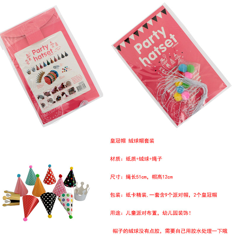 包装:纸卡精装,一套含9个派对帽,2个皇冠帽,包装尺寸约17*26cm