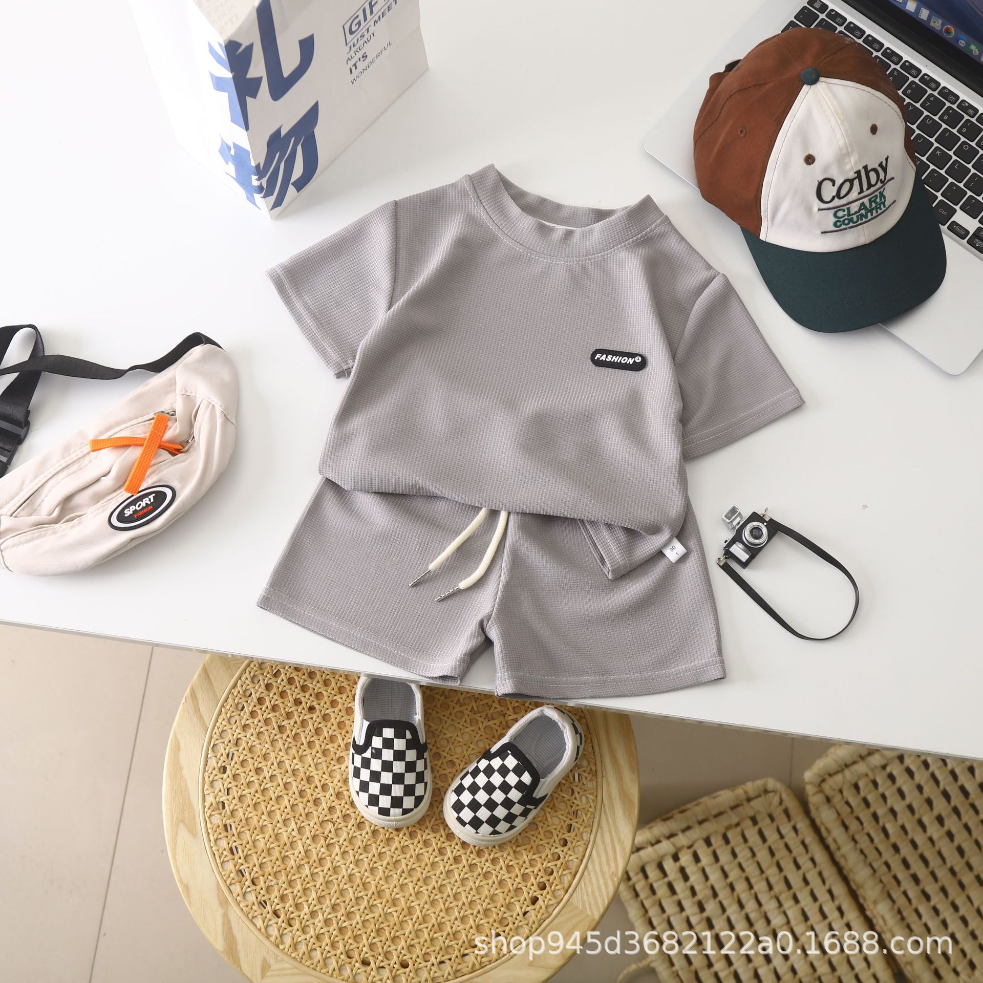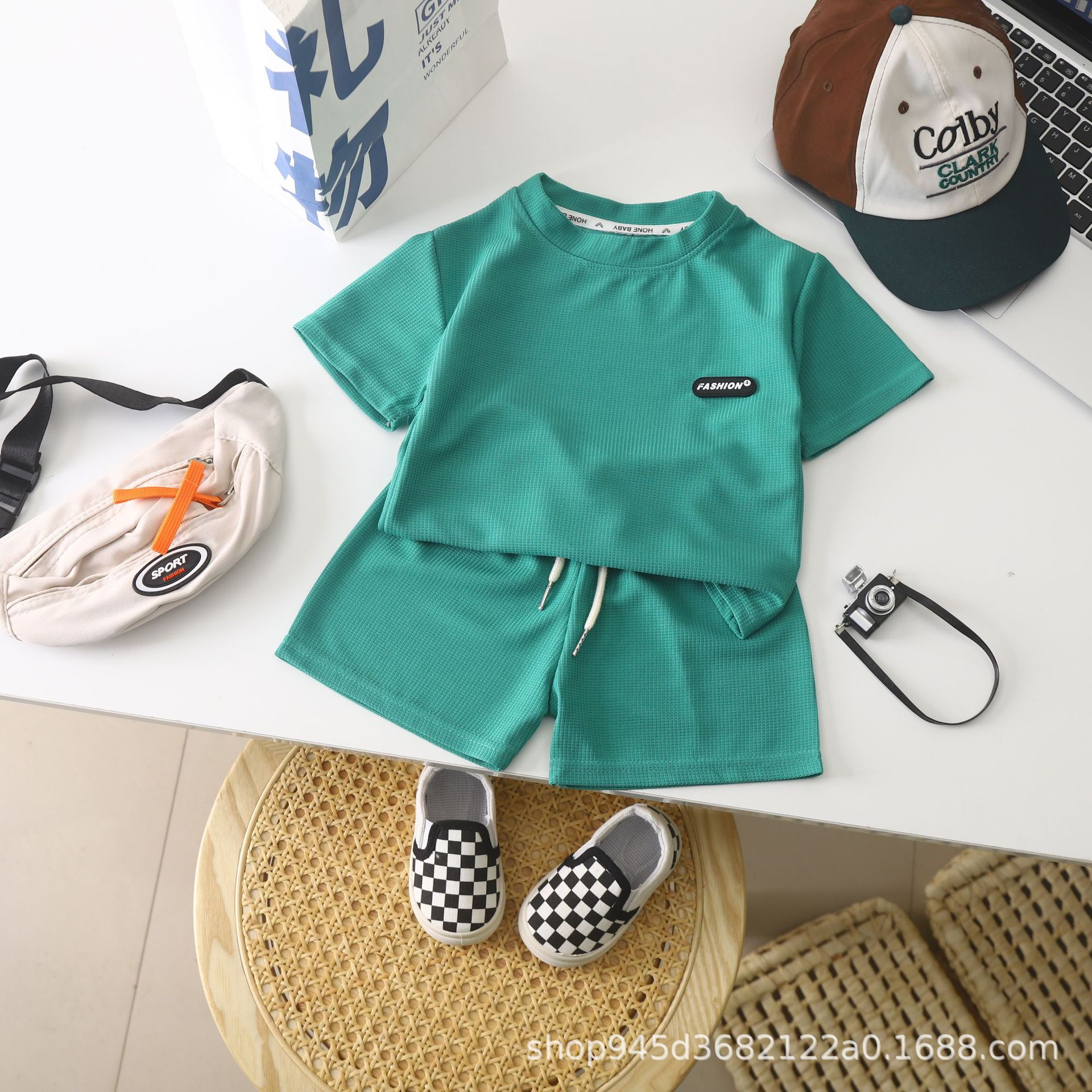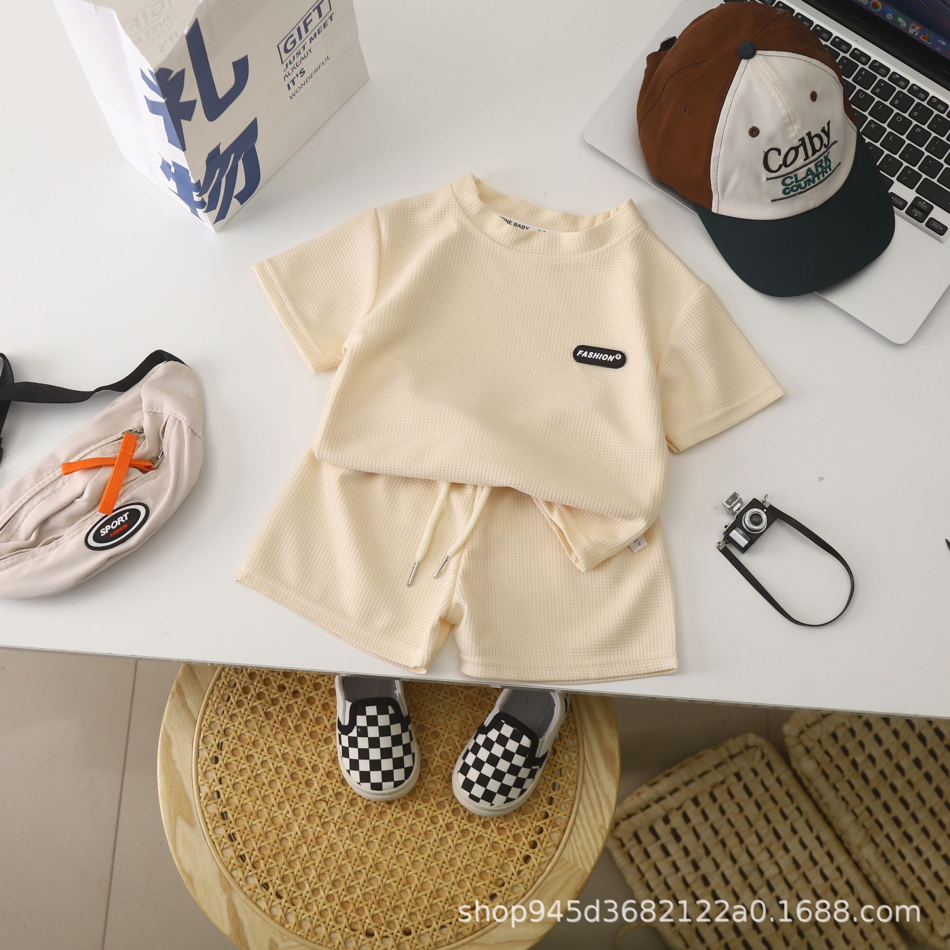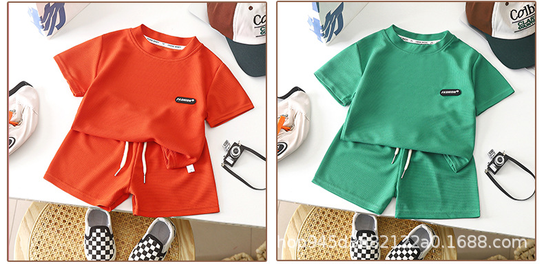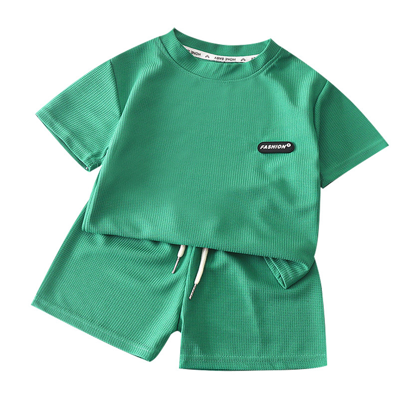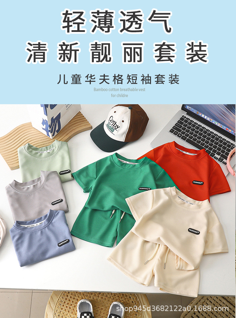 2025 новая детская одежда Весенний летний детский досуг набор свободный досуг для мужчин и женщин с короткими рукавами для детей вафли оптом