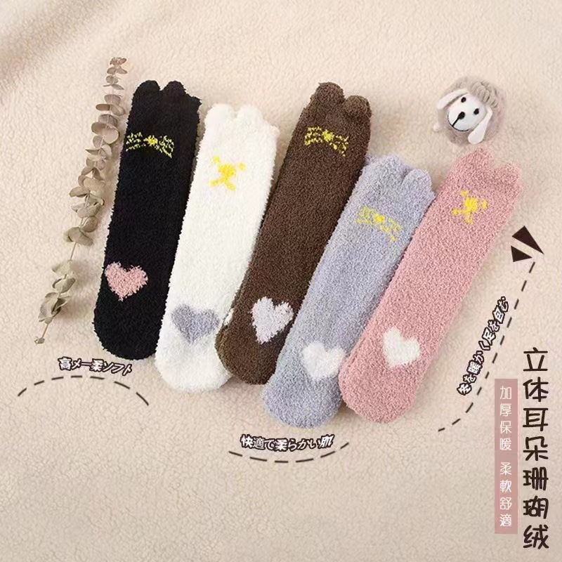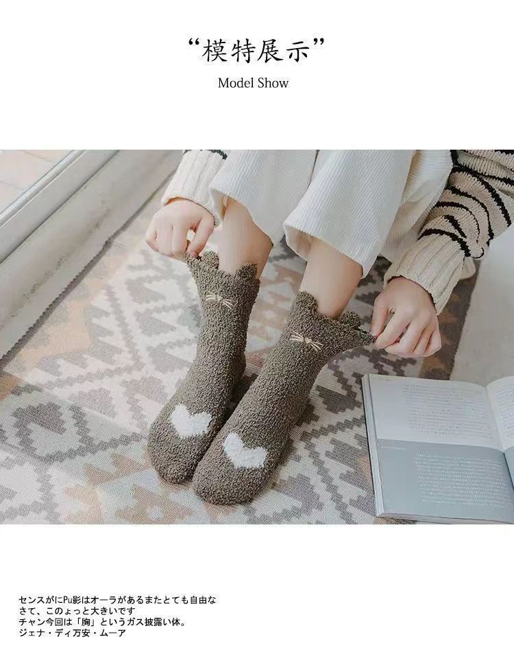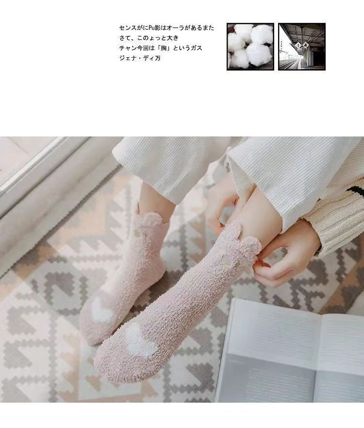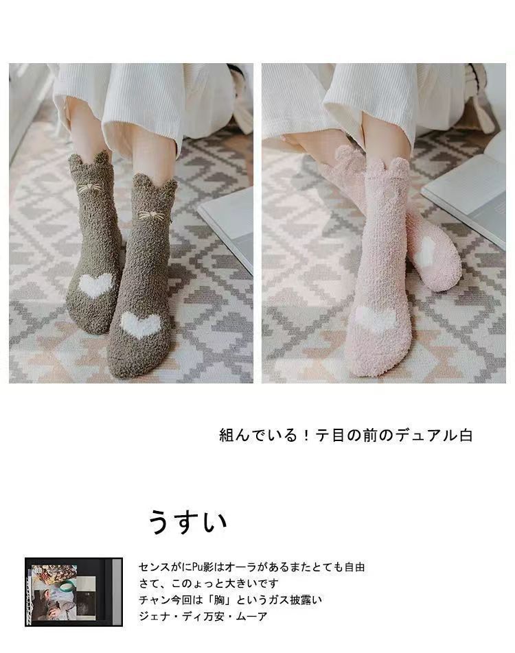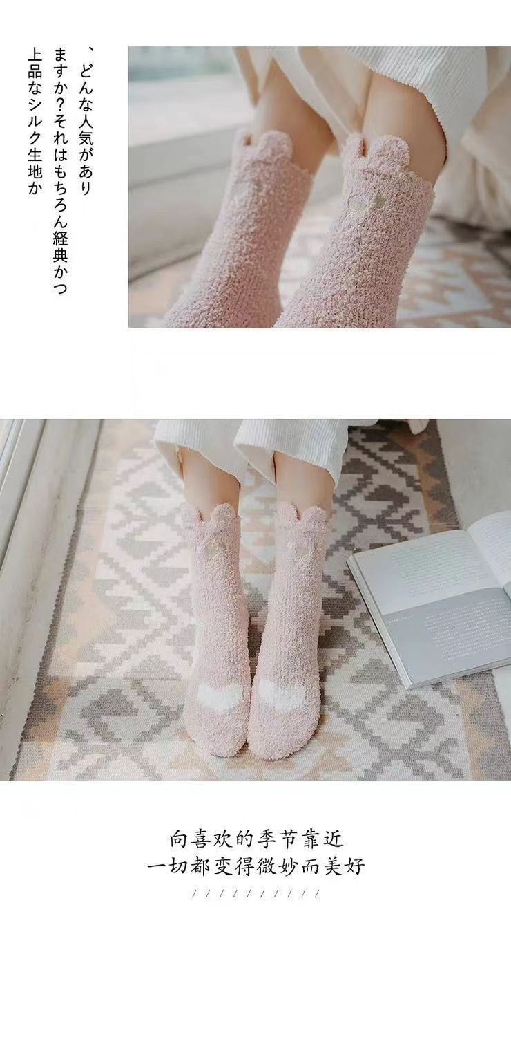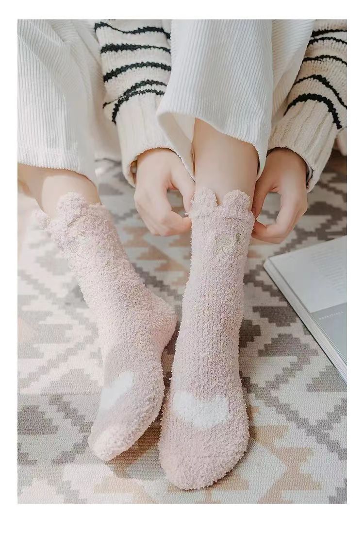 Осенне-Зимние коралловые бархатные носки, женские носки с мультяшными ушками, утолщенные теплые носки для сна в полу, чулки до середины икры на флисовой подкладке