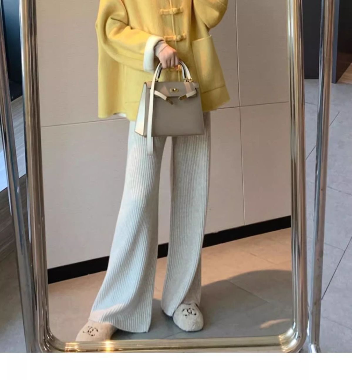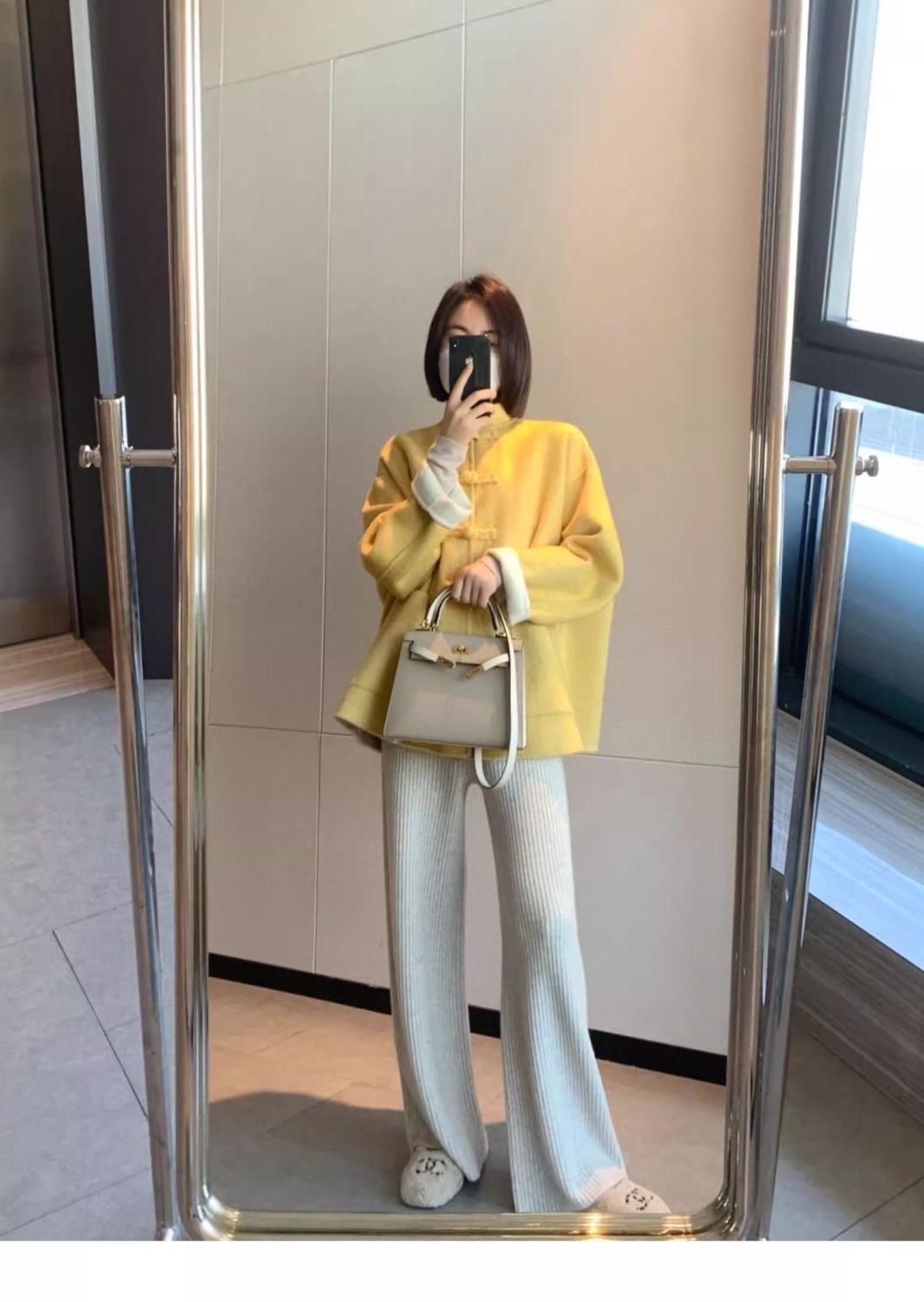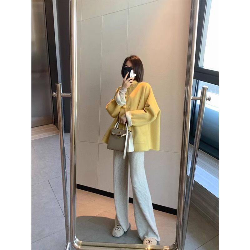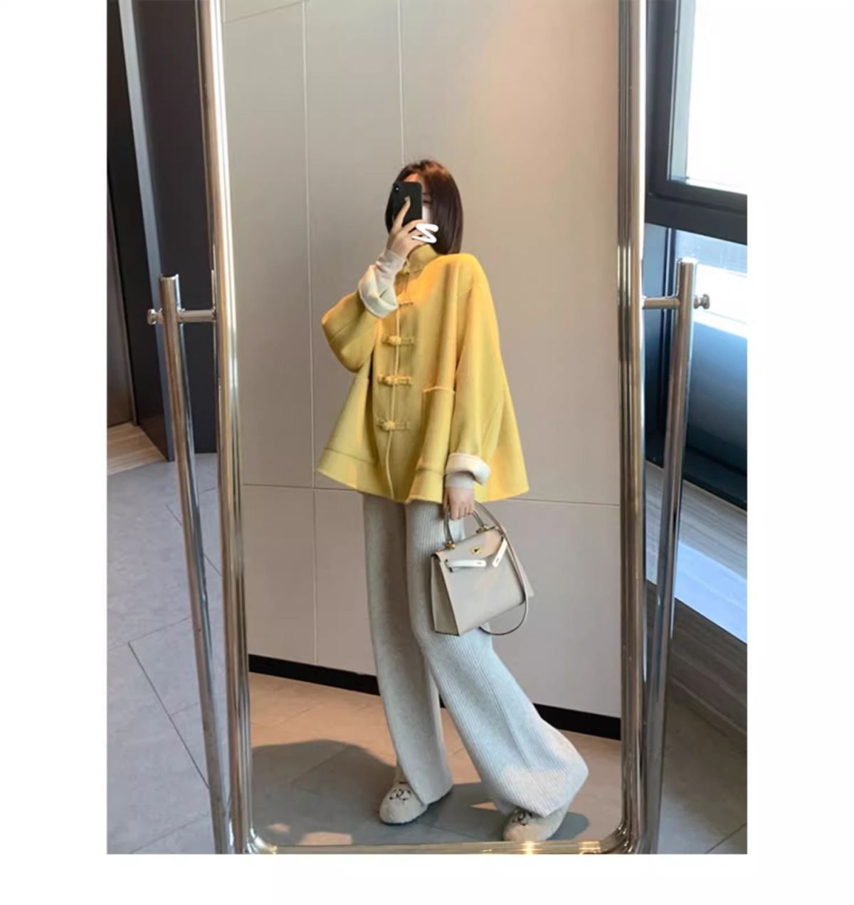 Новое желтое шерстяное пальто в китайском стиле, Женская осенне-зимняя повседневная мода, свободный маленький Универсальный Зимний топ с длинными рукавами