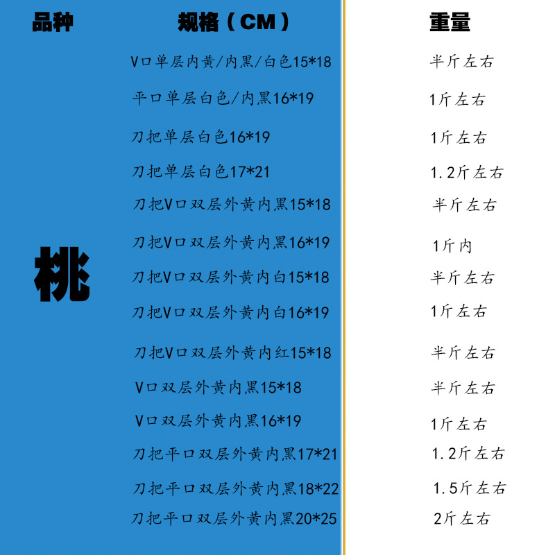 100 белый плоский рот двойное отверстие 15*18; 100 белых однослойных плоских рта 16*19; 100 ручек ножей белые плоские однослойные 16*19; 100 ручек ножей белые однослойные 17*21; 100 ручек для ножей, белые, однослойные, 18*22 см.; 100 ручек ножей с V-образным вырезом желтого цвета снаружи и черного цвета внутри, однослойные 15*18; 100 ручек ножей с V-образным вырезом желтого цвета снаружи и черного цвета внутри, однослойные 16*19; 100 ручек ножей с V-образным вырезом, внешняя желтая и внутренняя черная, двухслойная 16*19; 100 ручек ножей с V-образным вырезом, внешняя желтая и внутренняя белая, двухслойная 15*18; 100 ручек ножей с V-образным вырезом, внешняя желтая и внутренняя белая, двухслойная 16*19; 100 V-порт двухслойный желтый снаружи и белый внутри 15*18; 100 V-порт двухслойный внешний желтый и внутренний белый 16*19; 100 V-порт двухслойный желтый снаружи и красный внутри 15*18; 100 V-порт двухслойный желтый снаружи и красный внутри 16*19; 100 V-порт двухслойный желтый снаружи и черный внутри 1518; 100 V-порт двухслойный желтый снаружи и черный внутри 1619; 100 двухслойных ручек ножей с V-образным вырезом, желтые снаружи и красные внутри 15*18.; 100 двухслойных плоских рта, желтые снаружи и красные внутри 16*19; 100 ручек ножей, двухслойные, снаружи желтые, внутри черные 15*18.; 100 ручек ножей, двухслойные, снаружи желтые, внутри черные 16*19.; 100 ручек ножей, двухслойные, снаружи желтые, внутри черные 18*22.; 100 двухслойных плоских рта желтого цвета снаружи и желтого внутри 16*19; 100 ручек ножей, двухслойные, снаружи желтые, внутри желтые 18*22.; 100 ручек ножей, двухслойные, снаружи желтые, внутри черные, 20*25.; 100 ручек ножей, двухслойные, снаружи желтые, внутри черные, 20*30.; Ручка ножа снаружи желтая, внутри белая, двухслойная 16*19.; 100 ручек ножей с V-образным вырезом, внешняя желтая и внутренняя черная, двухслойная 17*21