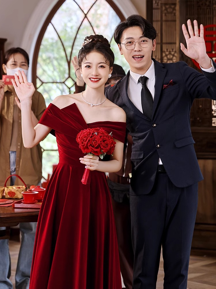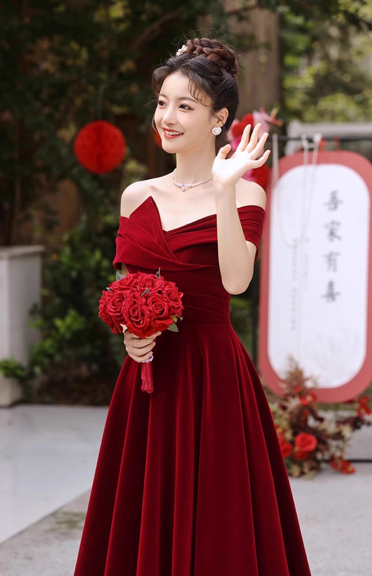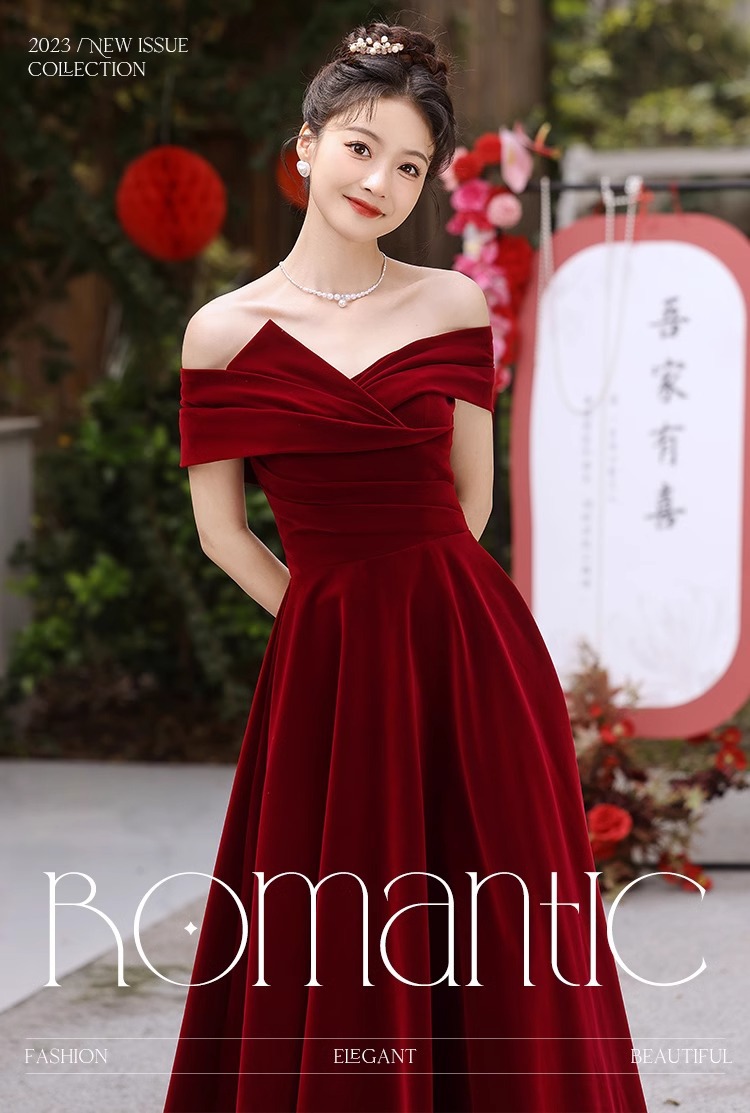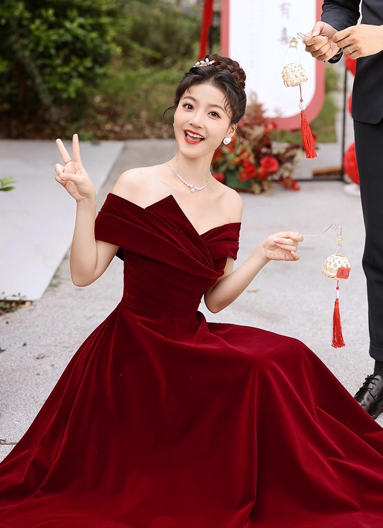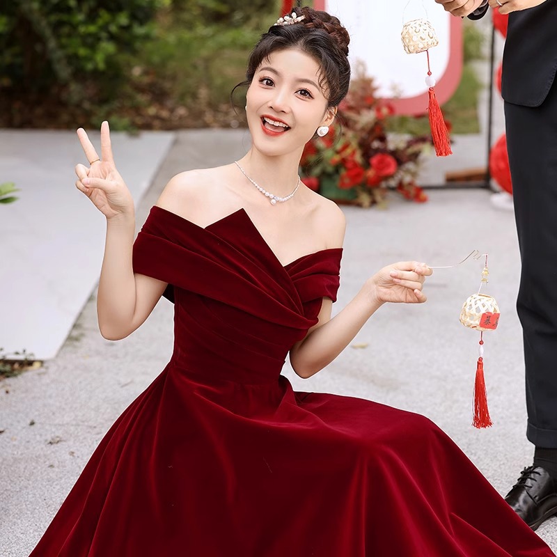 Платье-тост с открытыми плечами, новый стиль 2025 года для невысоких невест, бархатное платье для помолвки, повседневное платье для осеннего выпускного вечера.