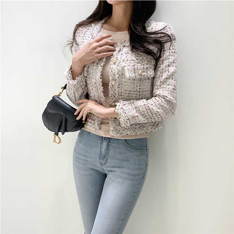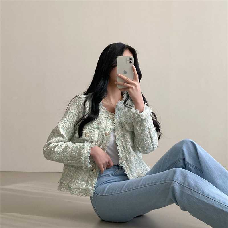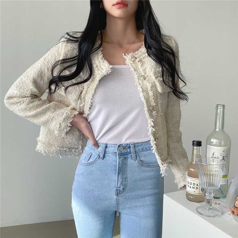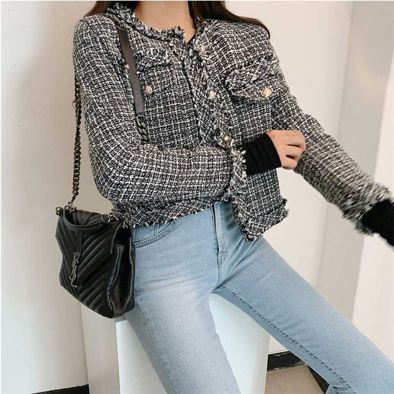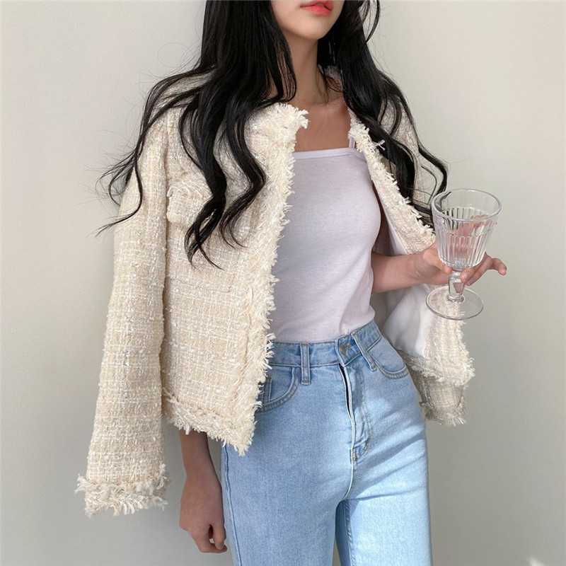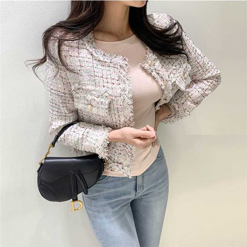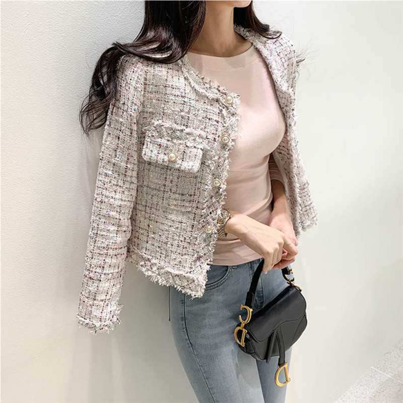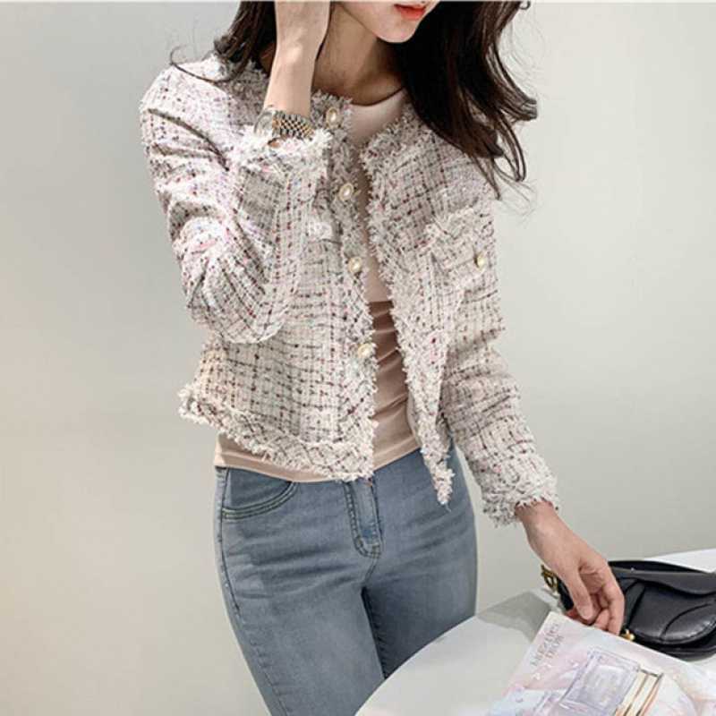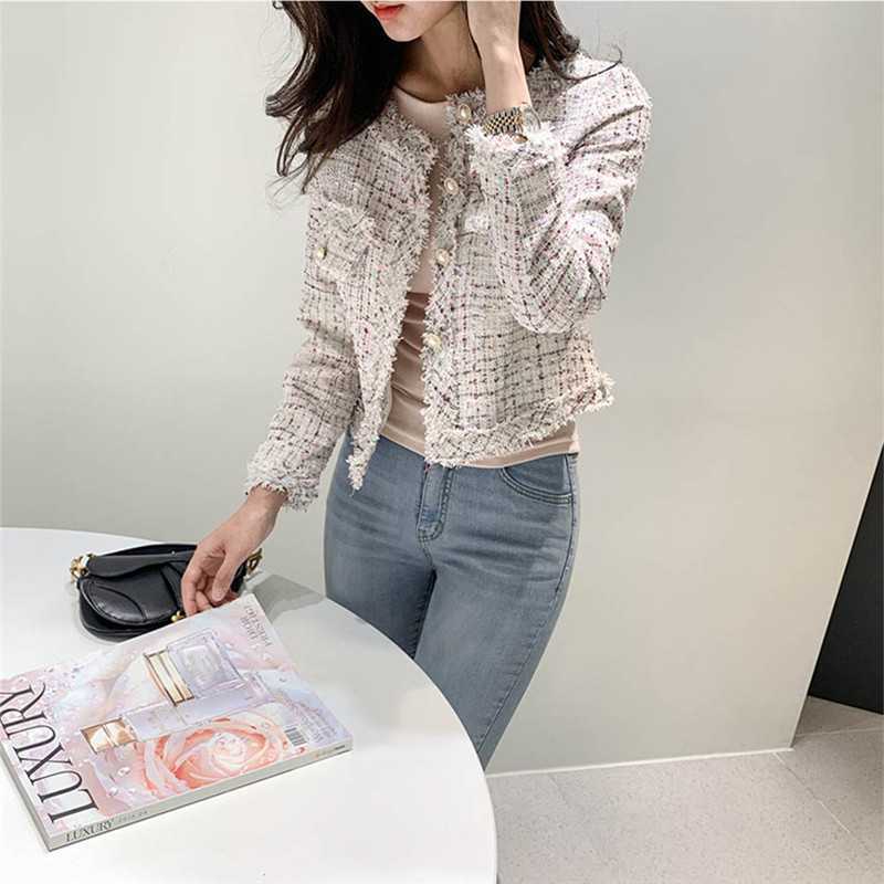 Пальто-кардиган в западном стиле с потертыми краями в стиле Chanel с круглым вырезом, женский весенний новый маленький твидовый короткий топ в Корейском стиле