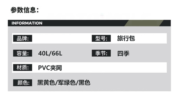 66л (60*37*39) + 4 быстросъемных ремня в подарок; 40 л (50*30*32) + 4 быстросъемных ремня в подарок; 20L; 50L; 70L; 100L; 120L(87*33*55CM)