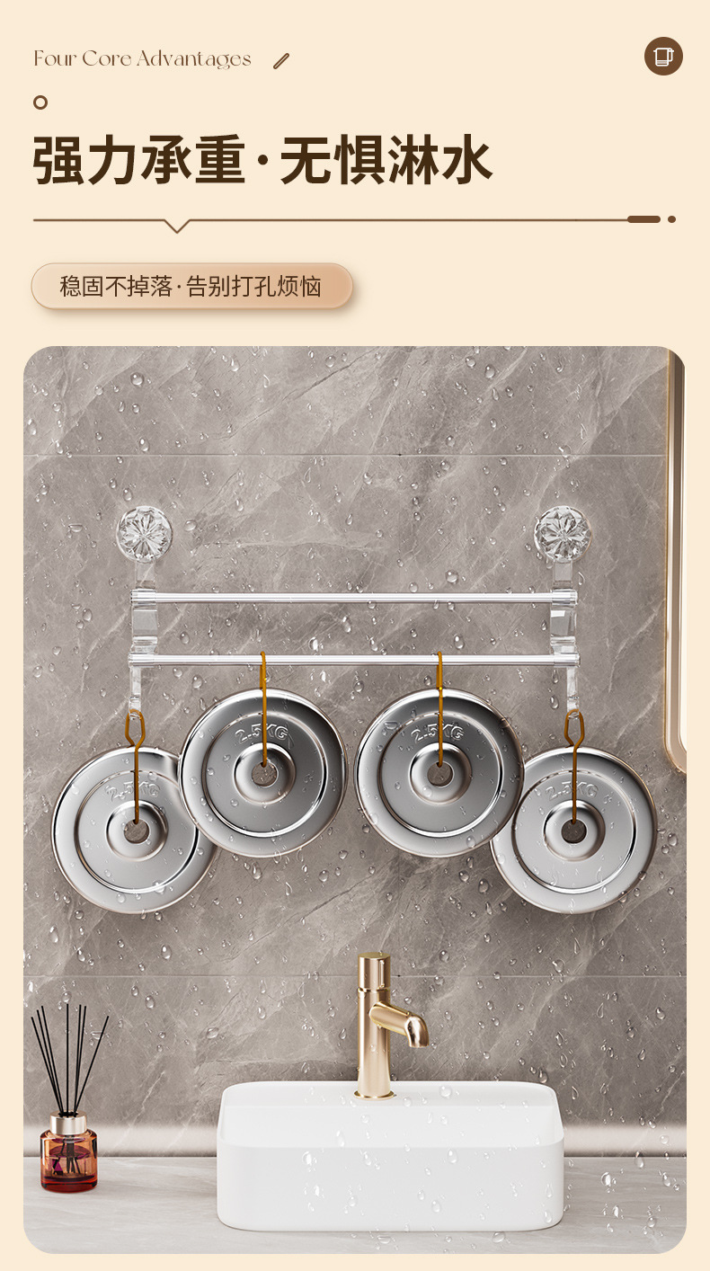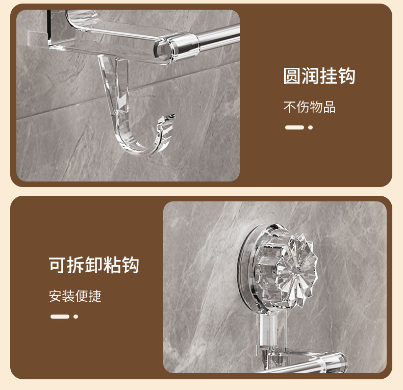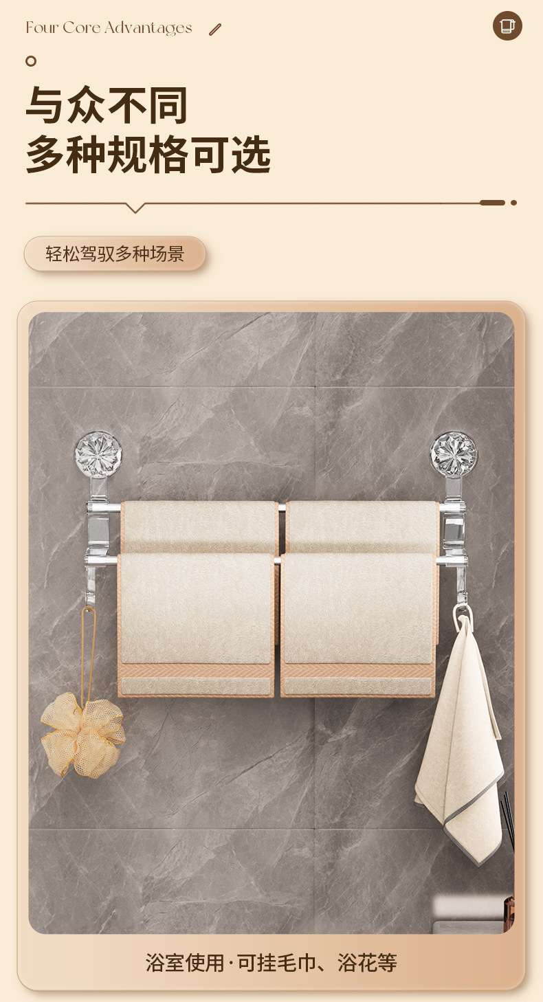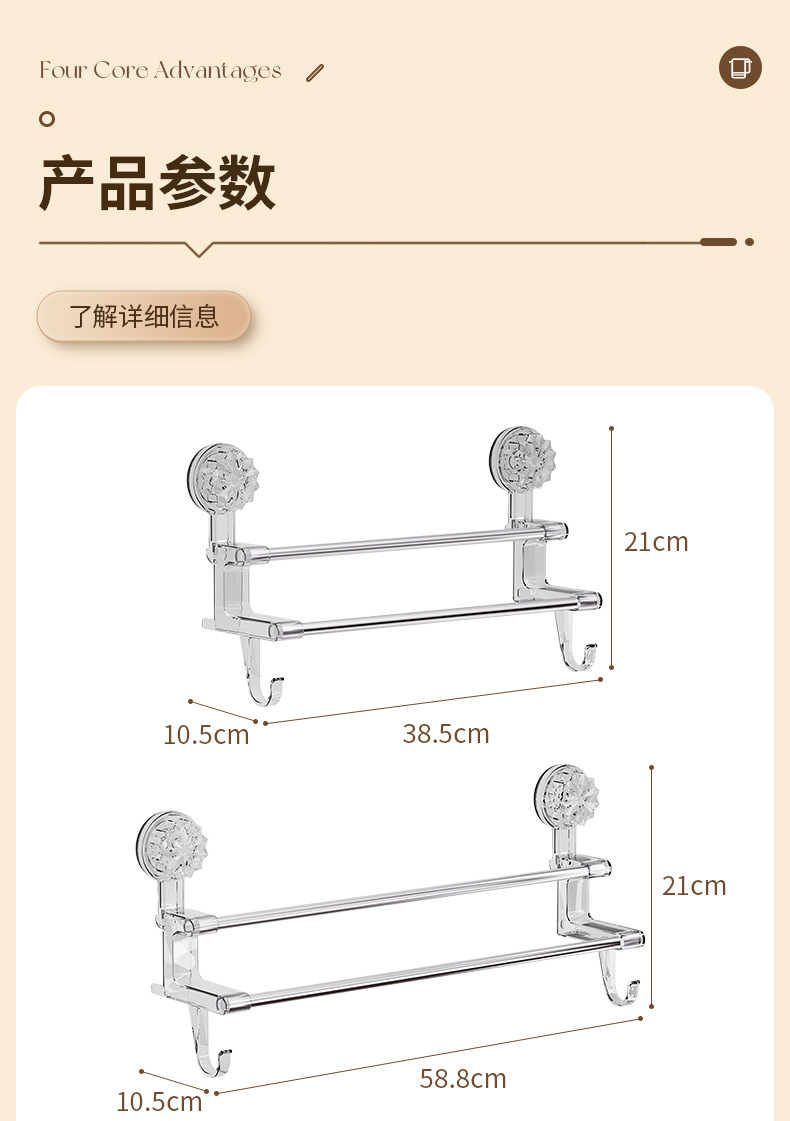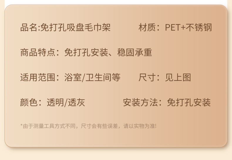 品名:轻奢吸盘毛巾架 颜色:透明/灰色 毛重长款310g 短款265g 净重长款234g短款205g 箱装数:长款64个 短款80个 箱规:长款65*55*55 短款:65*40*50
