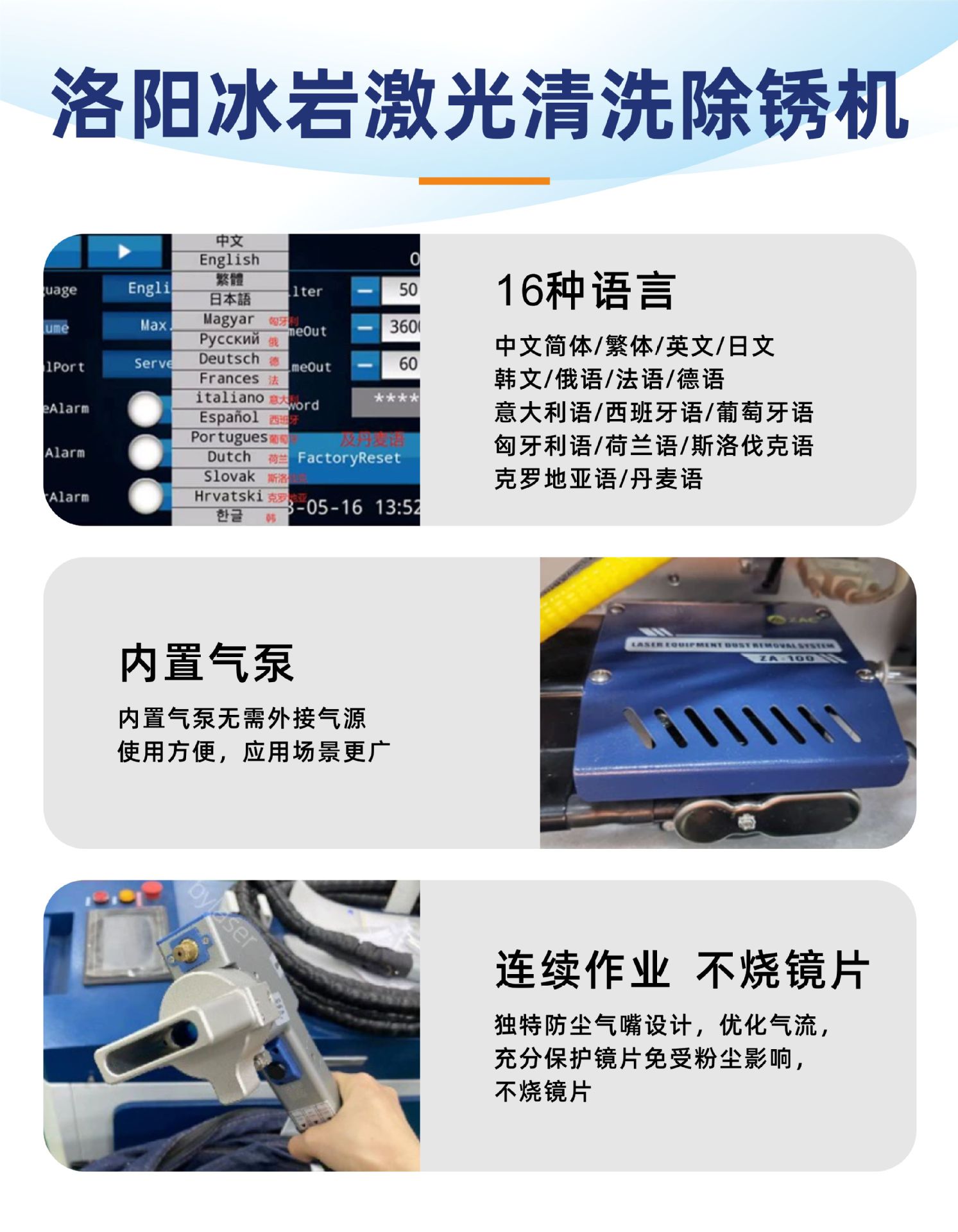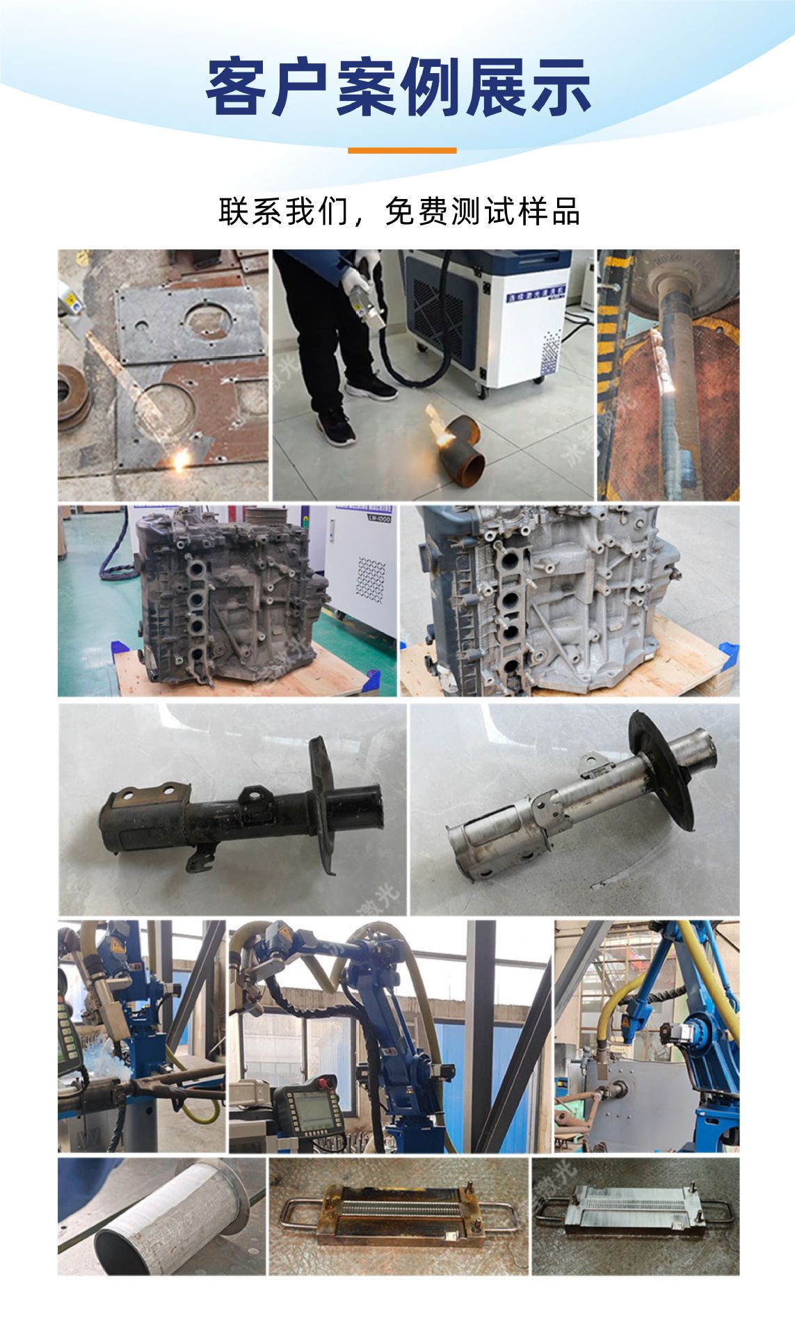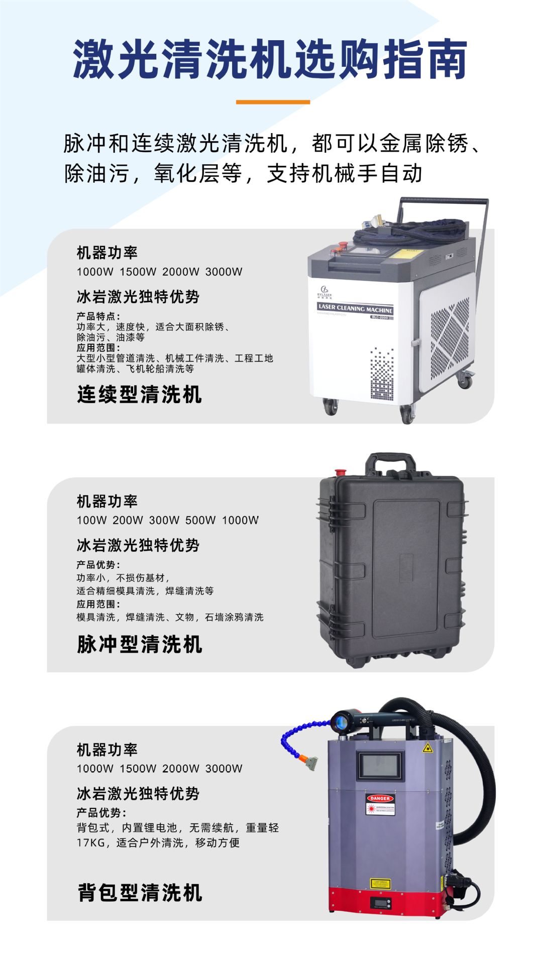 Ручной лазерный очиститель мощностью 1000 Вт (включая встроенный воздушный насос); Ручная машина для лазерной очистки мощностью 1500 Вт (включая встроенный воздушный насос); Ручная машина для лазерной очистки мощностью 2000 Вт (включая встроенный воздушный насос); Ручная машина для лазерной очистки мощностью 3000 Вт (включая встроенный воздушный насос); Импульсная очистительная машина мощностью 100 Вт (средняя конфигурация); Импульсная чистящая машина мощностью 200 Вт (залог); Импульсная чистящая машина мощностью 300 Вт (залог); Импульсная чистящая машина мощностью 500 Вт (залог); Настройка автоматизации манипулятора (депозит)