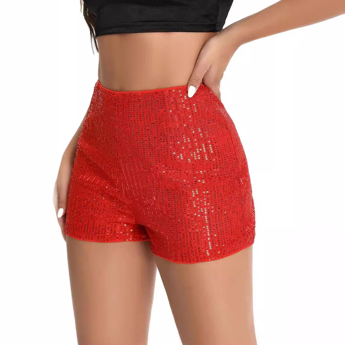 2023亚马逊独立站时尚珠片闪光修身热裤 亮片纯色黑色中腰性感直筒短裤
