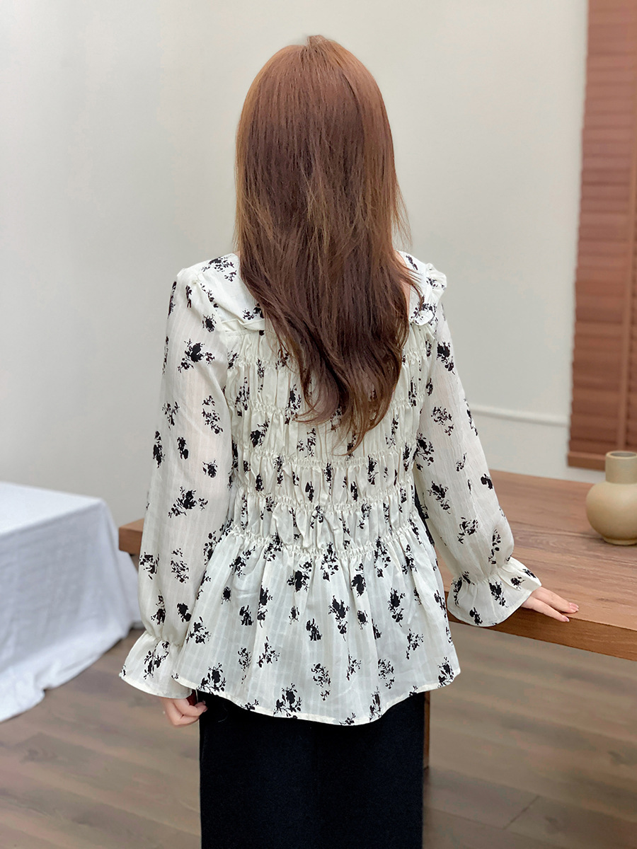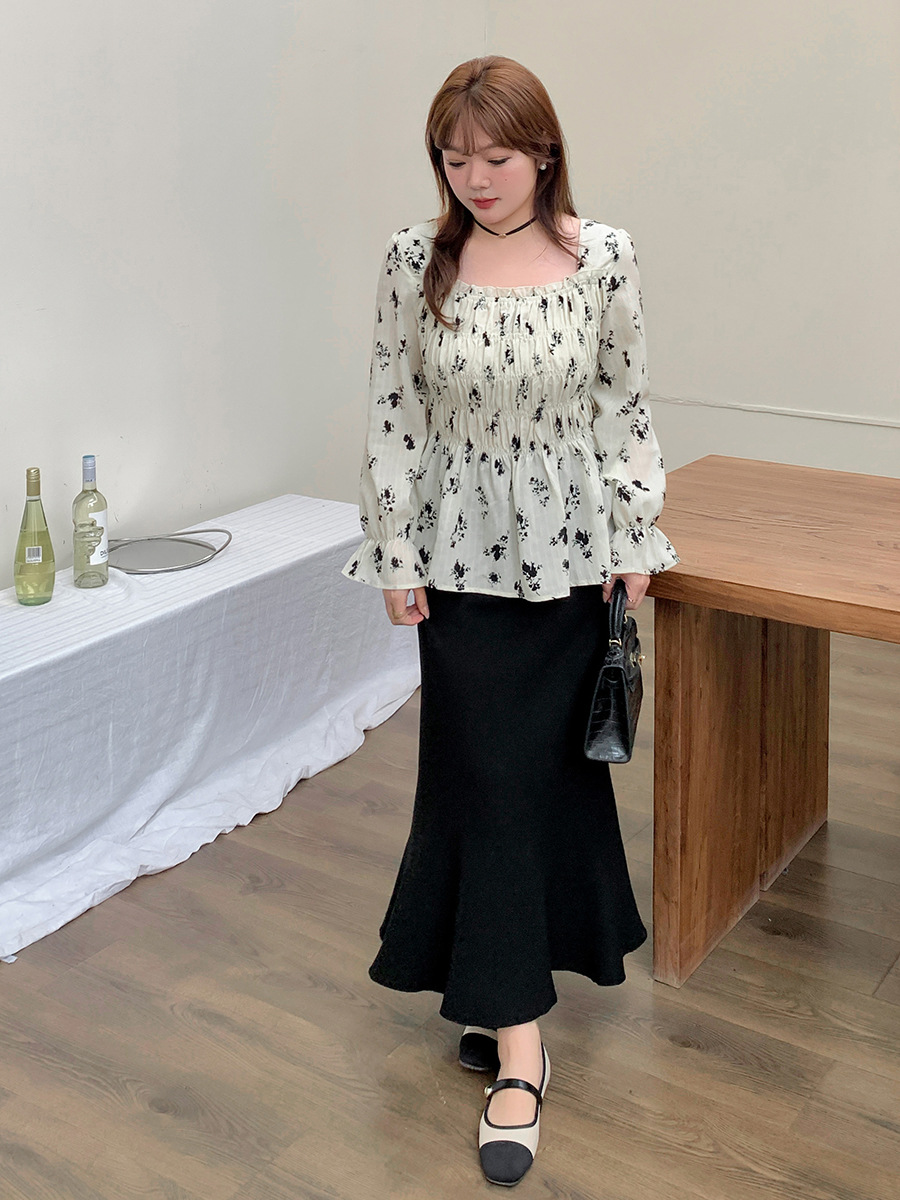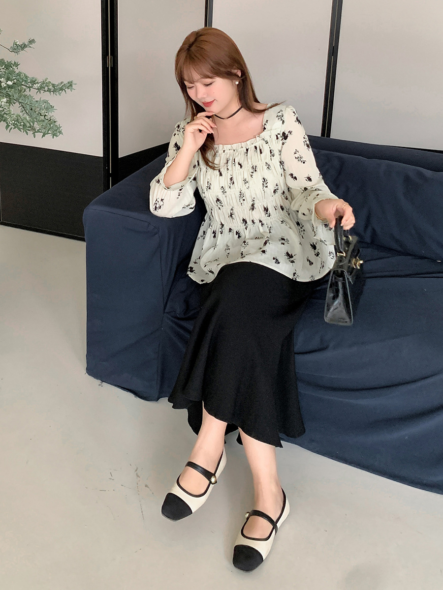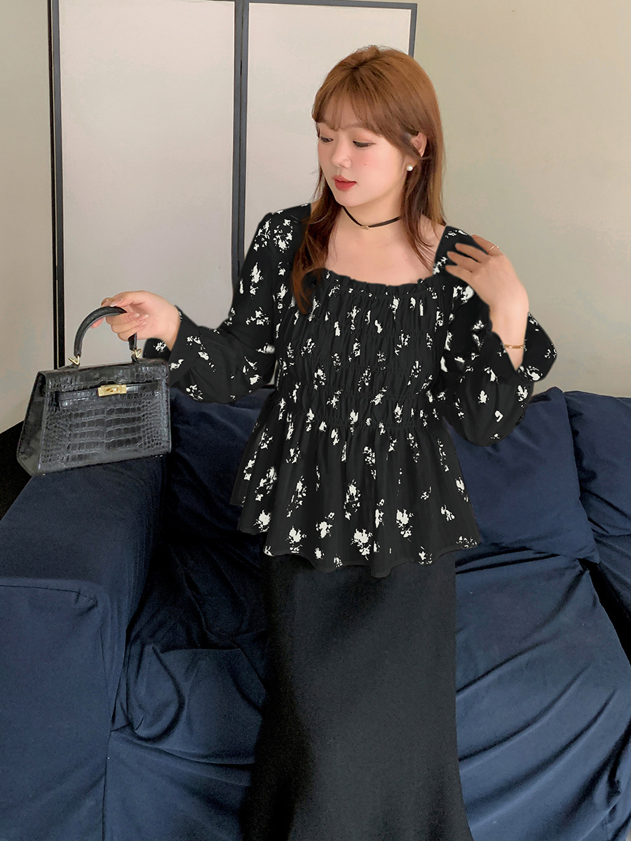 Осенняя новая шифоновая блузка с цветочным принтом и рюшами для перерыва на чай, новый осенний топ для похудения с квадратным вырезом больших размеров 140184